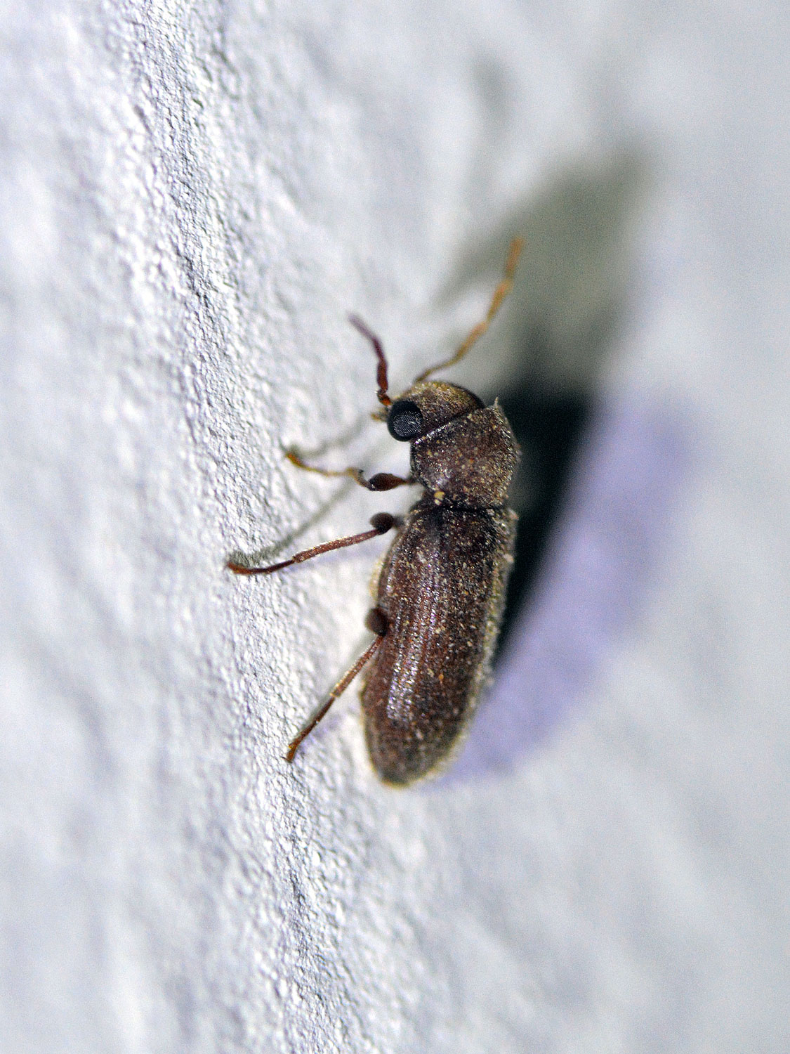 «En España se cita en varias provincias, y en la de Barcelona es, sin duda ninguna, el Anóbido más común en los muebles domésticos, destrozando tanto el duramen como la albura de maderas de frondosas especialmente. Este insecto constituye una auténtica plaga, ocasionando daños de importancia económica considerable, ya que en las zonas infectadas, el mobiliario construido con maderas de frondosas se puede asegurara que si no está ya atacado, su destino le llevará probablemente a ser pasto de ella. Ataca a maderas muertas (elaboradas o no), no muy viejas, pudiéndose decir que el ataque empieza a los cuatro o seis años de estar puesto en servicio el mueble, por cuyo motivo sus daños son más ostentosos y alarmantes. Suele aparecer de mayo a agosto, retrasándose o adelantándose, según que las condiciones de humedad y temperatura disminuyan o aumenten, siendo la fecha más aproximada la del 15 de junio al 15 de agosto. El ciclo vital dura de uno a dos años, y la puesta las hace muy escalonadamente durante la vida de la hembra, que suele durar de cinco a seis semanas. Es de costumbres poco voladoras, por lo que se pueden observar los adultos perfectamente en el interior de las casas sobre superficies blancas, a las que se dirigen preferentemente, como paredes, techos, visillos, etc. Pudiéndose cazar muy fácilmente con un matamoscas, o con la mano simplemente» [1].