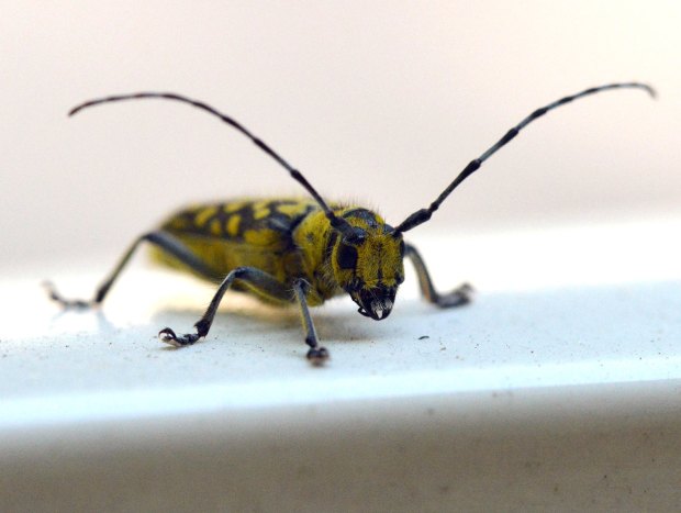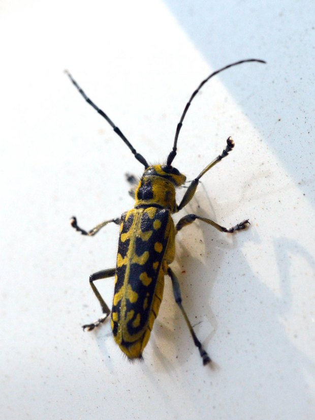 Estando en Santa Fe del Montseny, vi aterrizar un escarabajo sobre un lateral del coche. Al acercarme, vi que se trataba de un longicornio (cerambícido, Cerambycidae) de vistosa coloración. No estuvo ni dos minutos, lo justo para que pudiera hacerle unas fotografías. Caminó unos 10 centímetros y, cuando llegó a lo alto del coche, abrió sus alas y prosiguió su camino.