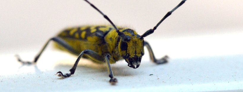 Estando en Santa Fe del Montseny, vi aterrizar un escarabajo sobre un lateral del coche. Al acercarme, vi que se trataba de un longicornio (cerambícido, Cerambycidae) de vistosa coloración. No estuvo ni dos minutos, lo justo para que pudiera hacerle unas fotografías. Caminó unos 10 centímetros y, cuando llegó a lo alto del coche, abrió sus alas y prosiguió su camino.