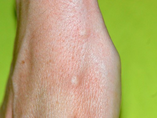 Hace cosa de un mes mi mujer estaba leyendo en la cama cuando notó picores en la mano derecha. Se rascó y miró hacia la zona donde le picaba. Vio unos habones bien redondeados e hinchados, signo inequívoco de que un flebotomo (Phlebotomus) rondaba por el dormitorio. Mi mujer me avisó y me puse a buscar al culpable, que encontré en el techo. Aproveché para sacarle unas fotografías (figura 1). Luego lo perseguí y conseguí meterlo en un frasco. También aproveché para sacar unas imágenes del habón típico. En la imagen número 2, se pueden ver tres habones, dos en mano y una en antebrazo. En la imagen número 3, se pueden ver ampliadas las picaduras de la mano derecha.