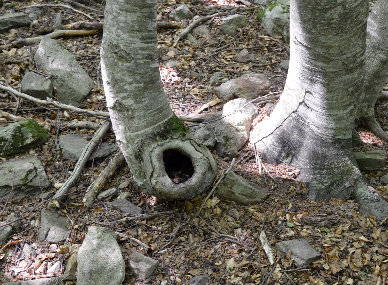 Hace unos días publiqué una entrada dedicada al Anopheles plumbeus, especie de mosquito de montaña que encontré en la Font de Passavets, en Santa Fe del Montseny [1]. Y junto a esta especie, también había Aedes geniculatus. Ambos mosquitos se pueden encontrar en bosques de montaña, ya que la larva se desarrolla en el agua acumulada en huecos de árboles como Quercus (roble, encina), Fagus (hayas), Alnus (alisos) o Betula (abedules) [2]. Es interesante el hecho de que esté ligado a este tipo de acumulaciones que suelen aparecer en árboles viejos. Y lógicamente, también está ligado a un régimen de lluvias que permita su subsistencia. En concreto, en la zona de Santa Fe del Montseny abunda el haya (Fagus sylvatica). En la imagen número 2, se puede ver un hueco en esta especie de árbol.