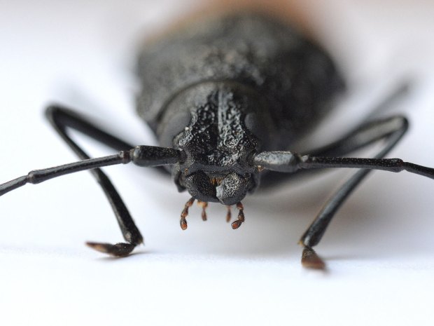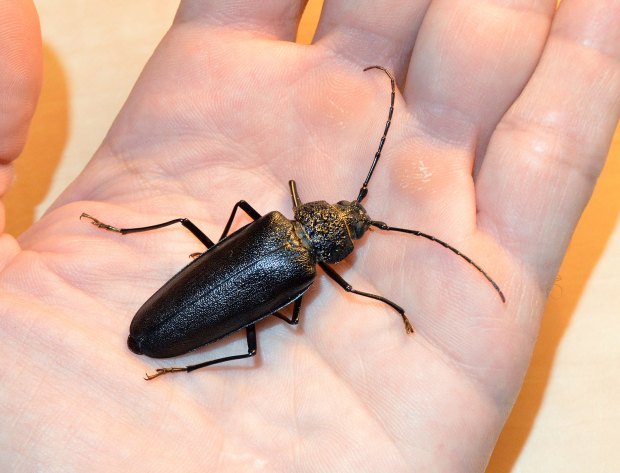 Según las fuentes, el imago del escarabajo carpintero pueden medir entre 30 y 60 milímetros. El ejemplar hembra de las imágenes mide cerca de 45 (figuras 2 y 3). Con estas considerables medidas, está considerado uno de los mayores escarabajos de Europa. De hecho, parece que es el segundo de mayor tamaño, por detrás del ciervo volador (Lucanus cervus). Su alimentación y vida es discreta. La larva se alimenta de madera en descomposición. Nunca de madera viva. Su ataque, como el de otros cerambícidos parecidos, no pasa desapercibido por las grandes perforaciones que deja el imago al salir. Seguramente, paseando por la montaña hayáis visto un tocón o tronco caído con unos agujeros de unos 2 centímetros de diámetro [1].