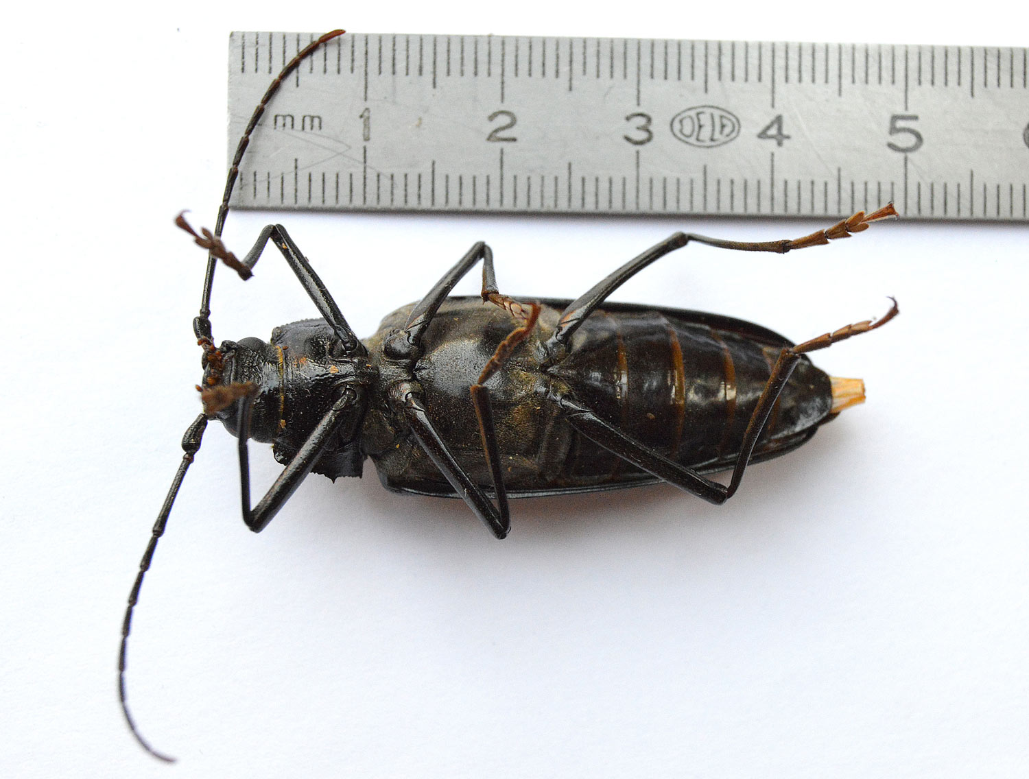 Según las fuentes, el imago del escarabajo carpintero pueden medir entre 30 y 60 milímetros. El ejemplar hembra de las imágenes mide cerca de 45 (figuras 2 y 3). Con estas considerables medidas, está considerado uno de los mayores escarabajos de Europa. De hecho, parece que es el segundo de mayor tamaño, por detrás del ciervo volador (Lucanus cervus). Su alimentación y vida es discreta. La larva se alimenta de madera en descomposición. Nunca de madera viva. Su ataque, como el de otros cerambícidos parecidos, no pasa desapercibido por las grandes perforaciones que deja el imago al salir. Seguramente, paseando por la montaña hayáis visto un tocón o tronco caído con unos agujeros de unos 2 centímetros de diámetro [1].
