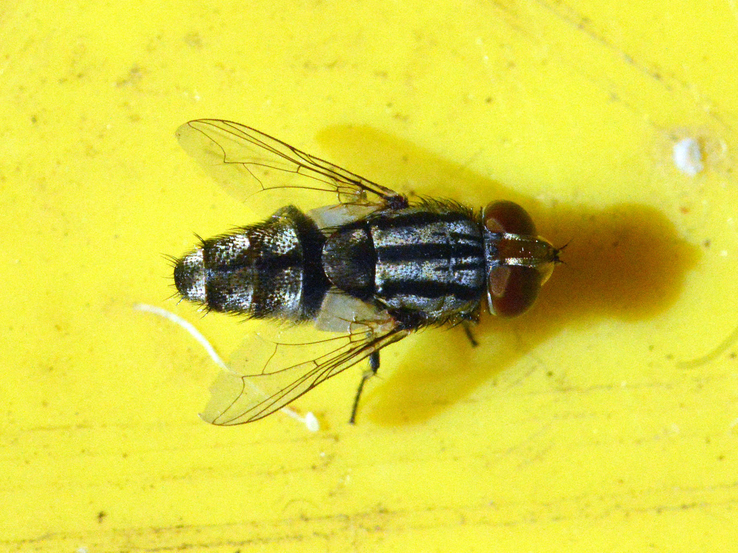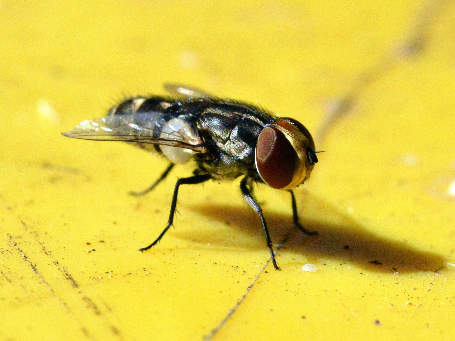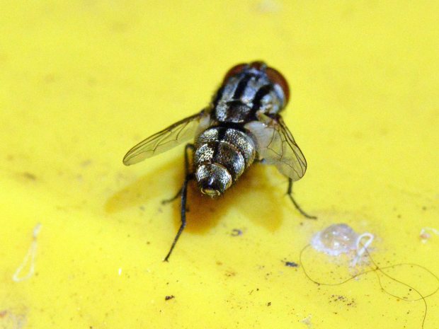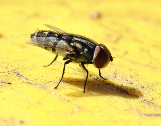 Un contenedor de basura es un buen lugar donde encontrar moscas. Y más en verano cuando las altas temperaturas aceleran el proceso de fermentación. Cuando llevo la cámara encima, suelo echar una mirada por encima de los contenedores. Hace unos días, me encontré con una mosca interesante que estaba posada sobre una tapa amarilla. El contraste entre sus colores oscuros y el amarillo era atractivo. Me acerqué con cuidado y pude hacerle algunas fotografías. Además de interesante, me parece una mosca de gran belleza. Es de las moscas con mejor porte que he fotografiado. Tiene unos ojos grandes y rojos, y un cuerpo alargado que acaba en punta roma. Pertenece al género Miltogramma, el cual es de la familia de los sarcofágidos (Sarcophagidae).
