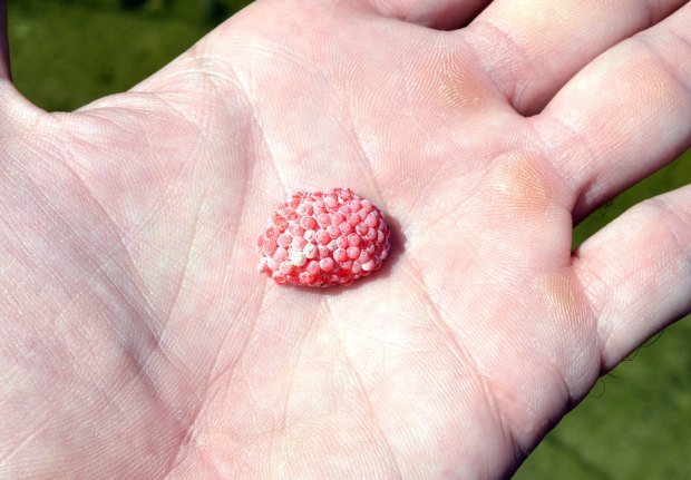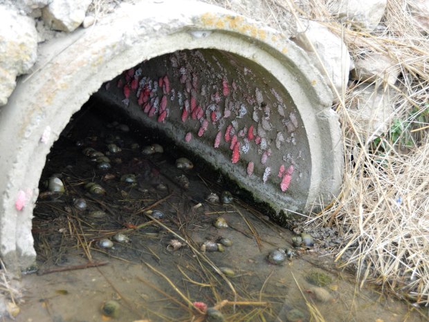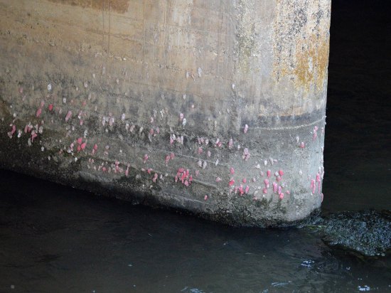 Fig 2. Puestas de caracol manzana sobre el pilar de un puente en el hemidelta norte./ Desinsectador 2016