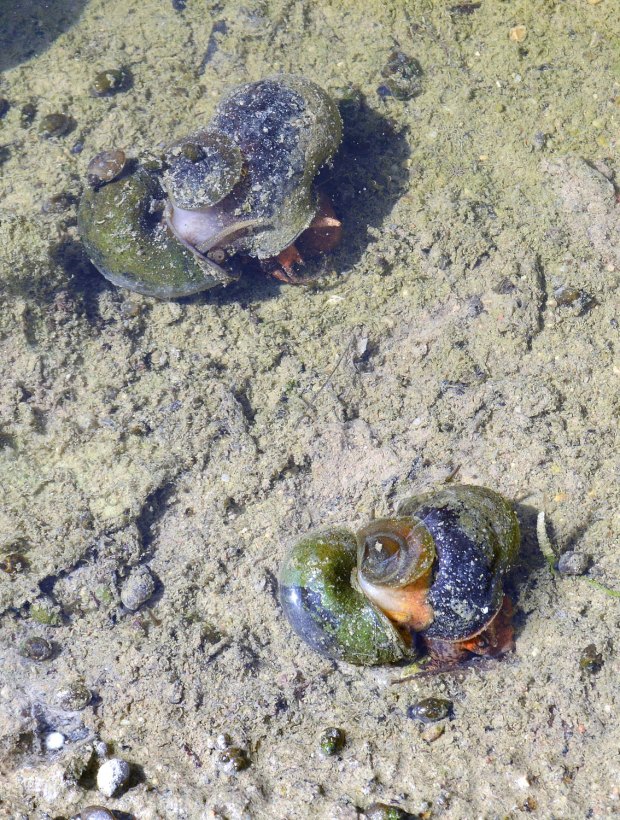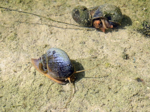 Me entretuve viendo cómo el caracol manzana realizaba la puesta (figuras de 5 a 8). Al atardecer, emergen las hembras y trepan por donde encuentren un soporte duro. Si estuvieran en un campo de arroz, lo harían por la propia planta. Pero los que están en los canales lo hacen por donde pueden. Y un buen lugar son las paredes de cemento, pilares de puentes, tubos de conducción, etc. Estuve un rato entretenido viendo cómo los huevos iban saliendo uno a uno. Resbalaban por el caracol e iban a parar sobre la pared. Poco a poco, pero sin parar, se iba formando un plastón de color rosa brillante. Este comportamiento de poner los huevos fuera del agua es para evitar a los depredadores. Pero no lo podría hacer si no fuera porque el caracol manzana puede respirar tanto dentro como fuera del agua. Posee pulmones y branquias. Esto le da una capacidad de colonización muy grande. No solo porque puede salir al exterior, sino porque puede vivir en aguas pobres en oxígeno. Toma el aire del exterior a través de un largo sifón. En la imagen número 12, se puede ver al caracol de la izquierda con su sifón extendido.
