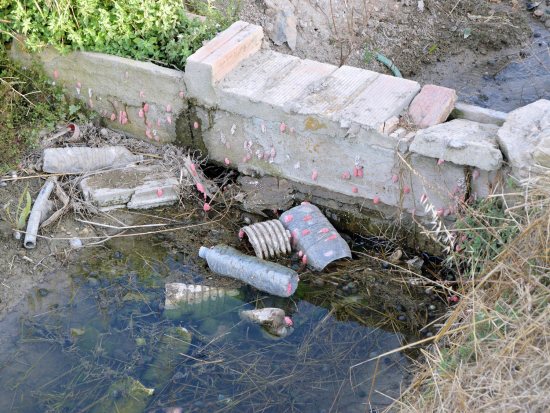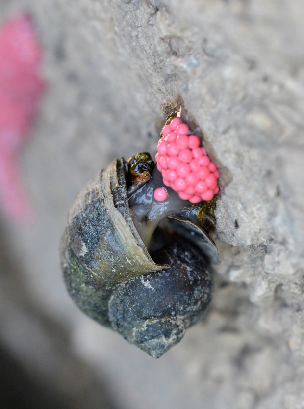 Hace unas semanas estuve en el Delta del Ebro. Me moví básicamente por el hemidelta norte. En mis paseos, pude observar la extensión del caracol manzana (Pomacea insularum). La primera vez que vi este caracol en la zona fue en 2012. Entonces no lo vi tan extendido. Ahora, se puede ver por todos los canales de riego. En la tres primeras fotografías, se puede ver una estampa que se repite. Se trata de las puestas realizadas por este caracol sobre paredes, piedras y cualquier otro elemento que tenga cierta resistencia. En la imagen número 3, se puede ver incluso sobre botellas de plástico que han quedado varadas sobre el barro. Aún sabiendo lo trágico de la situación, estas puestas tienen su atractivo estético. Destaca el rosa sobre el fondo grisáceo del cemento. Y este color no es abundante en el paisaje.