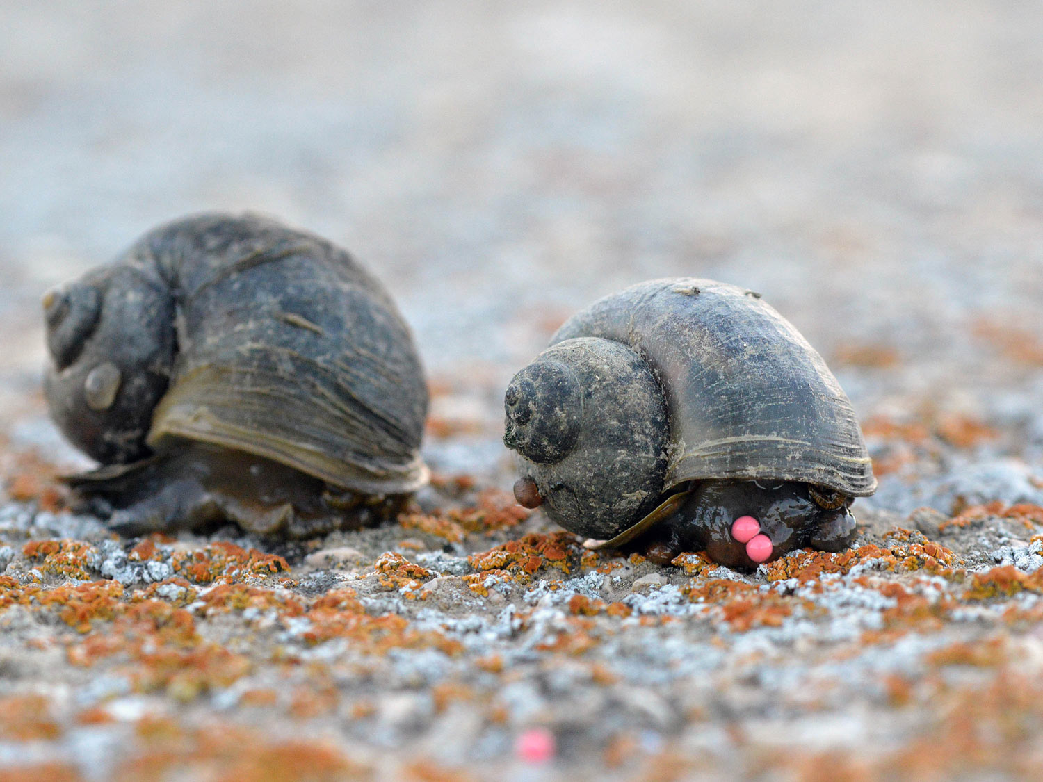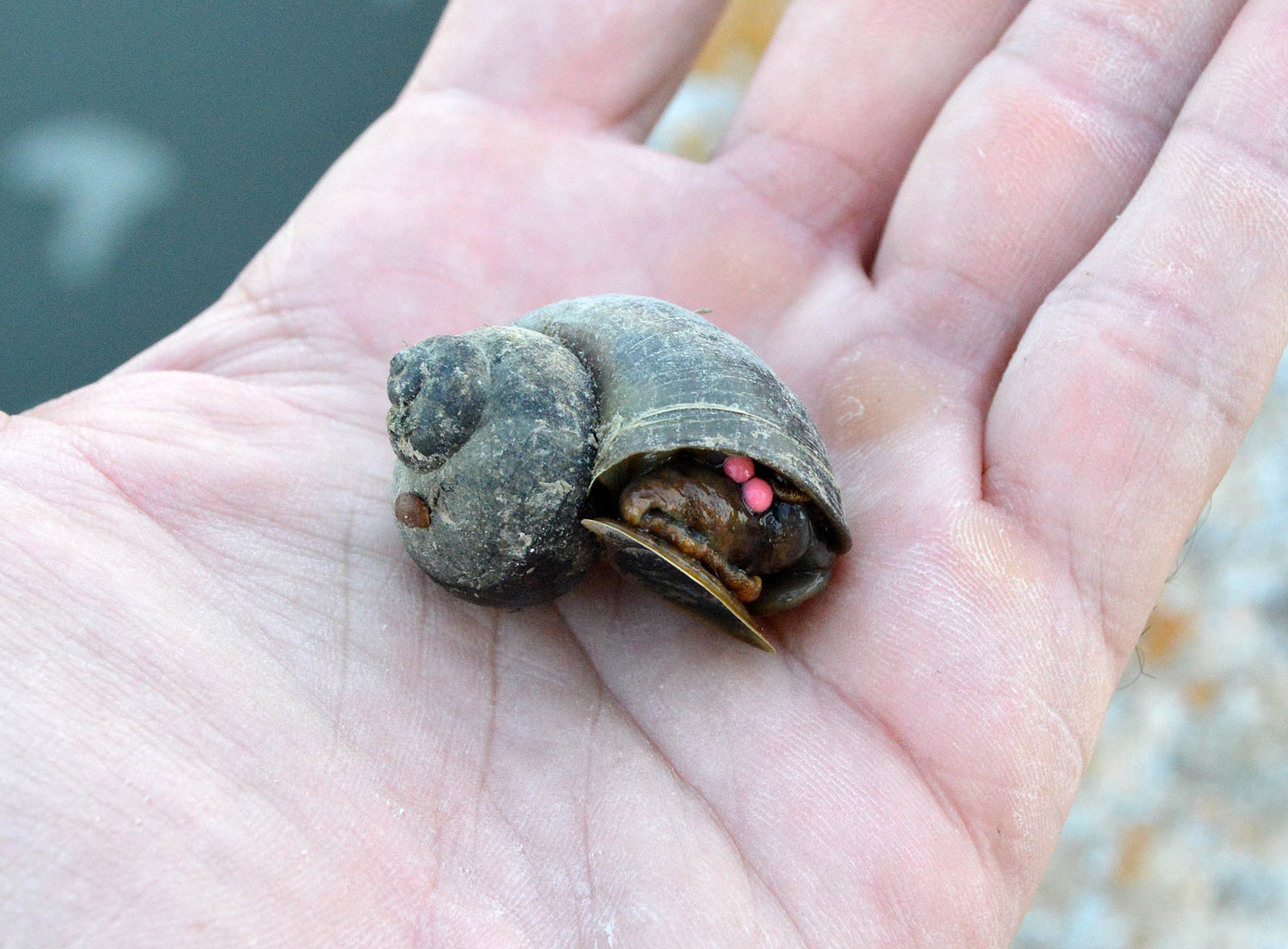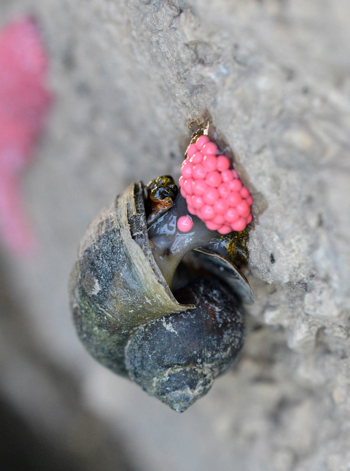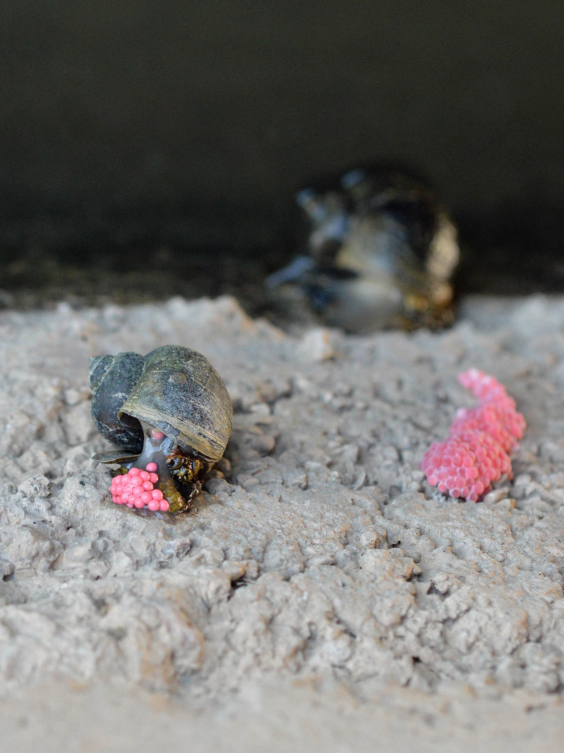 Me entretuve viendo cómo el caracol manzana realizaba la puesta (figuras de 5 a 8). Al atardecer, emergen las hembras y trepan por donde encuentren un soporte duro. Si estuvieran en un campo de arroz, lo harían por la propia planta. Pero los que están en los canales lo hacen por donde pueden. Y un buen lugar son las paredes de cemento, pilares de puentes, tubos de conducción, etc. Estuve un rato entretenido viendo cómo los huevos iban saliendo uno a uno. Resbalaban por el caracol e iban a parar sobre la pared. Poco a poco, pero sin parar, se iba formando un plastón de color rosa brillante. Este comportamiento de poner los huevos fuera del agua es para evitar a los depredadores. Pero no lo podría hacer si no fuera porque el caracol manzana puede respirar tanto dentro como fuera del agua. Posee pulmones y branquias. Esto le da una capacidad de colonización muy grande. No solo porque puede salir al exterior, sino porque puede vivir en aguas pobres en oxígeno. Toma el aire del exterior a través de un largo sifón. En la imagen número 12, se puede ver al caracol de la izquierda con su sifón extendido.