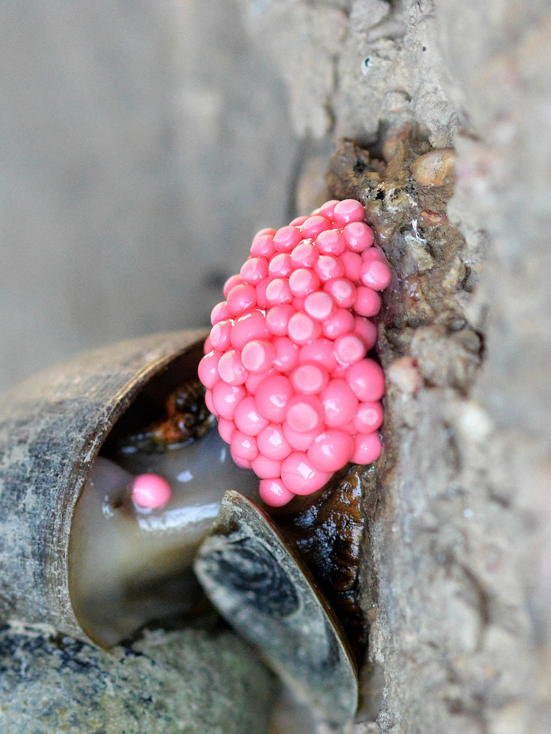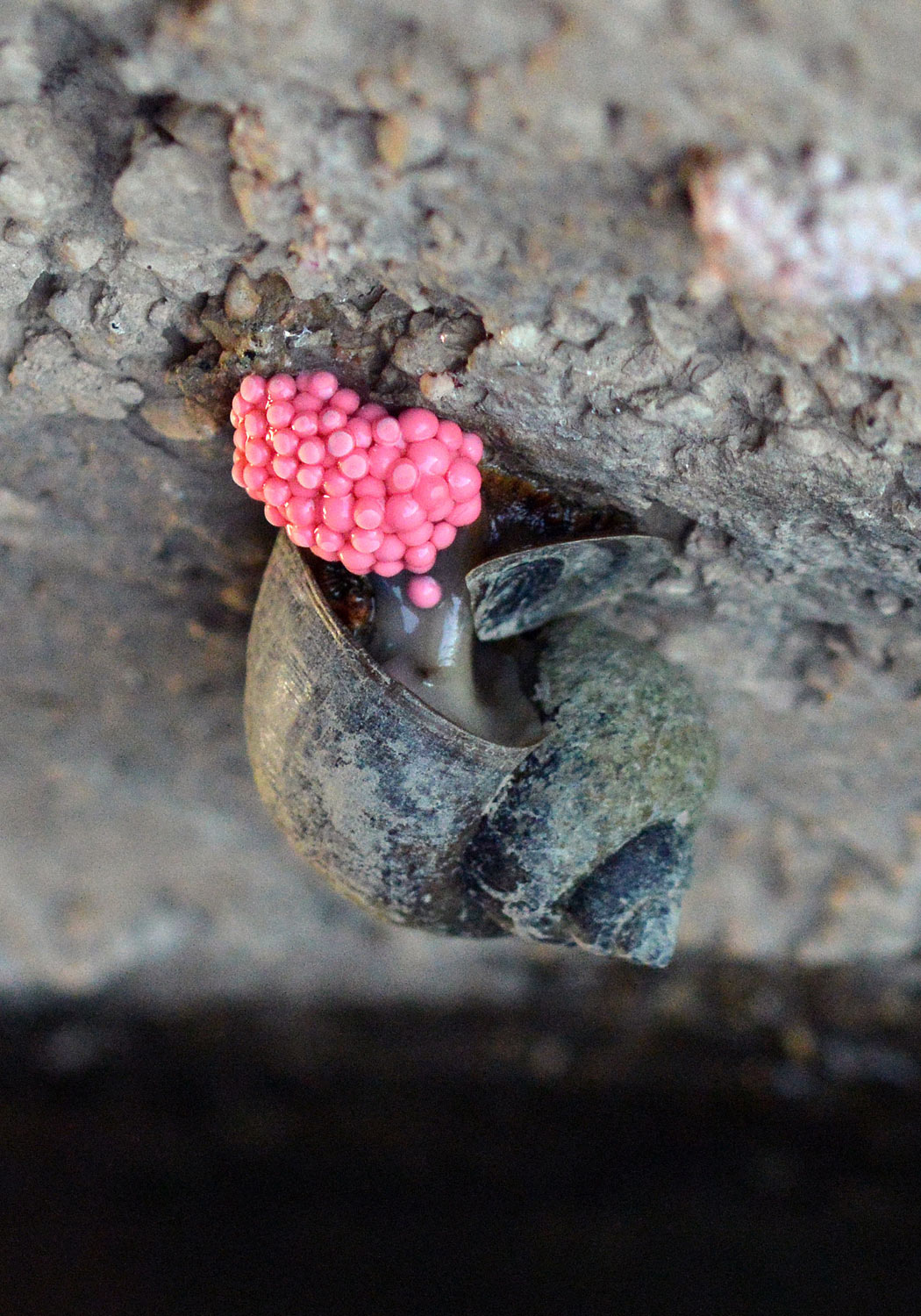 Hace unas semanas estuve en el Delta del Ebro. Me moví básicamente por el hemidelta norte. En mis paseos, pude observar la extensión del caracol manzana (Pomacea insularum). La primera vez que vi este caracol en la zona fue en 2012. Entonces no lo vi tan extendido. Ahora, se puede ver por todos los canales de riego. En la tres primeras fotografías, se puede ver una estampa que se repite. Se trata de las puestas realizadas por este caracol sobre paredes, piedras y cualquier otro elemento que tenga cierta resistencia. En la imagen número 3, se puede ver incluso sobre botellas de plástico que han quedado varadas sobre el barro. Aún sabiendo lo trágico de la situación, estas puestas tienen su atractivo estético. Destaca el rosa sobre el fondo grisáceo del cemento. Y este color no es abundante en el paisaje.