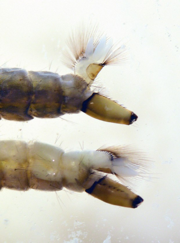 En el río Bassí en Prats del Lluçanès (Barcelona), a 700 metros de altitud, recolecté larvas de C. pipiens y de C. longiareolata. Como se puede ver en las imágenes 7 y 8, donde muestro larvas de estas dos especies, C. longiareolata es mayor. También lo es el adulto. Y como se puede tanto la larva como el adulto de esta especie es de las más fáciles de identificar. Por lo menos a mí me lo parece. Tiene unas características que marcan la diferencia con otras especies. La larva tiene el sifón corto y surcado de dos hileras de espinas (figura 9). El adulto tiene bien marcadas las líneas del tórax y en las patas aparecen bien contrastadas manchas oscuras y claras (figuras 3 y 4).