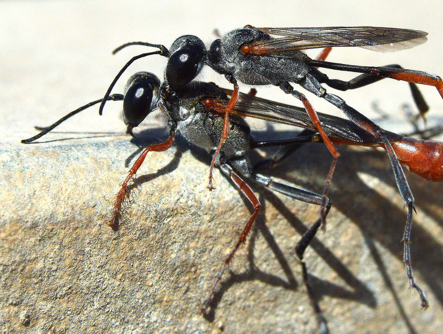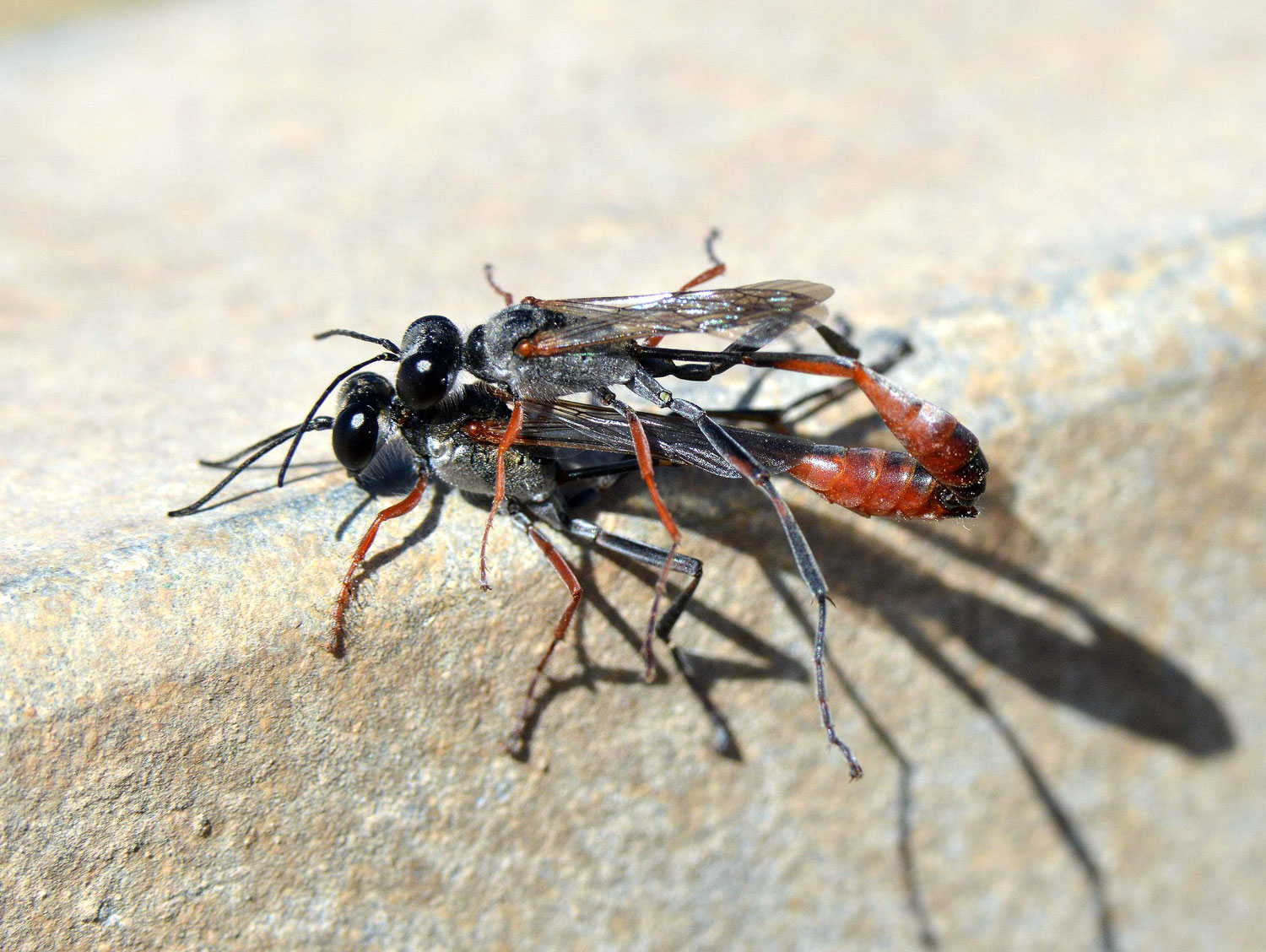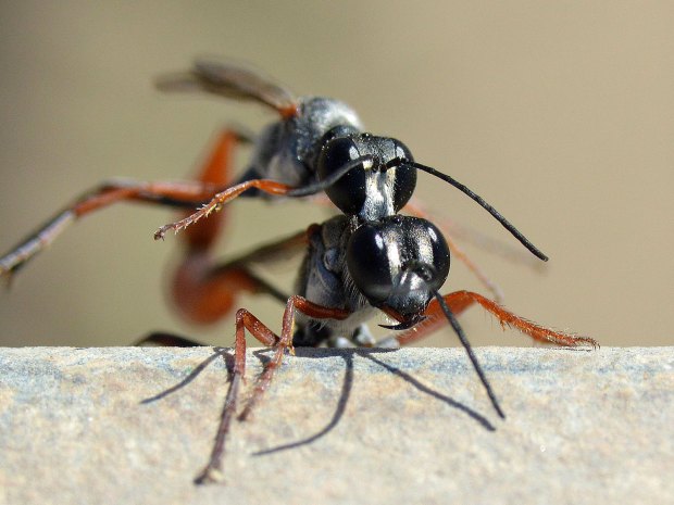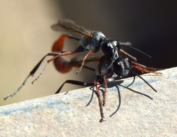 Otras especies de esta familia excavan la celda en el suelo. Este es el caso de las avispas que se pueden ver en las imágenes. Se trata de un macho y una hembra del género Ammophila que están realizando la cópula. No es fácil hacer una fotografía a estas avispas porque no paran quietas. Anduve un rato tras de ellas sin suerte. Y cuando estaba a punto de desistir, vi esta pareja. Cuando los insectos realizan la cópula es un buen momento para tomar fotos. Aguantan más la intromisión.