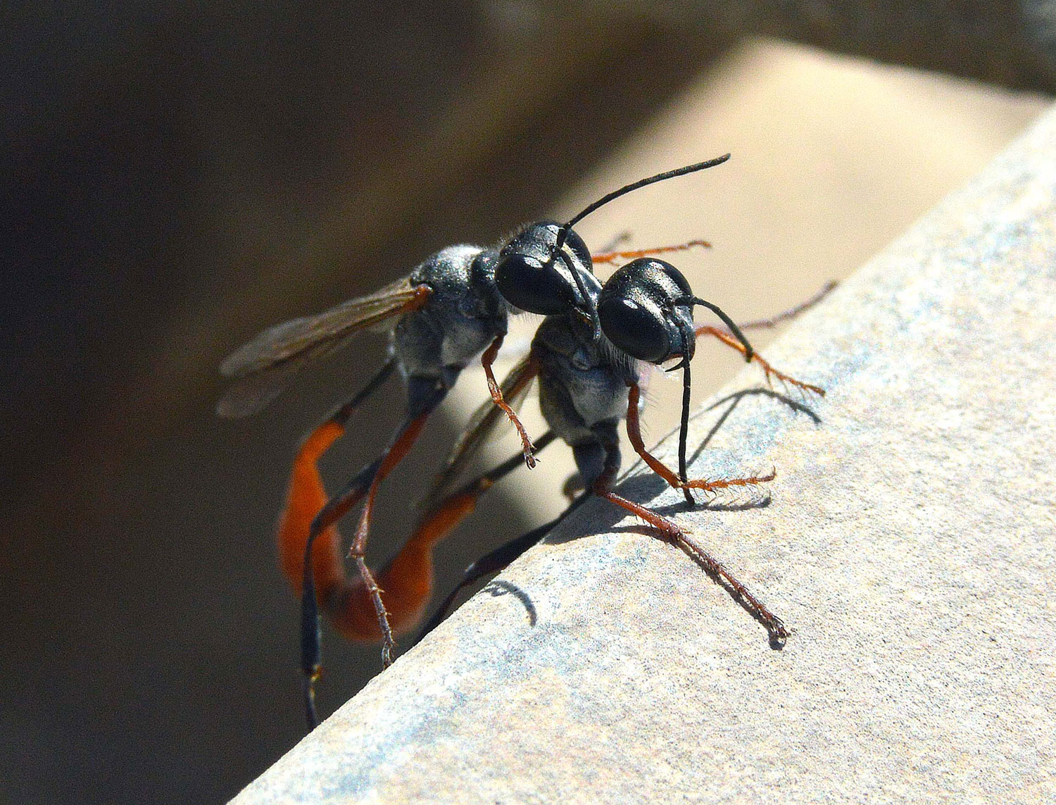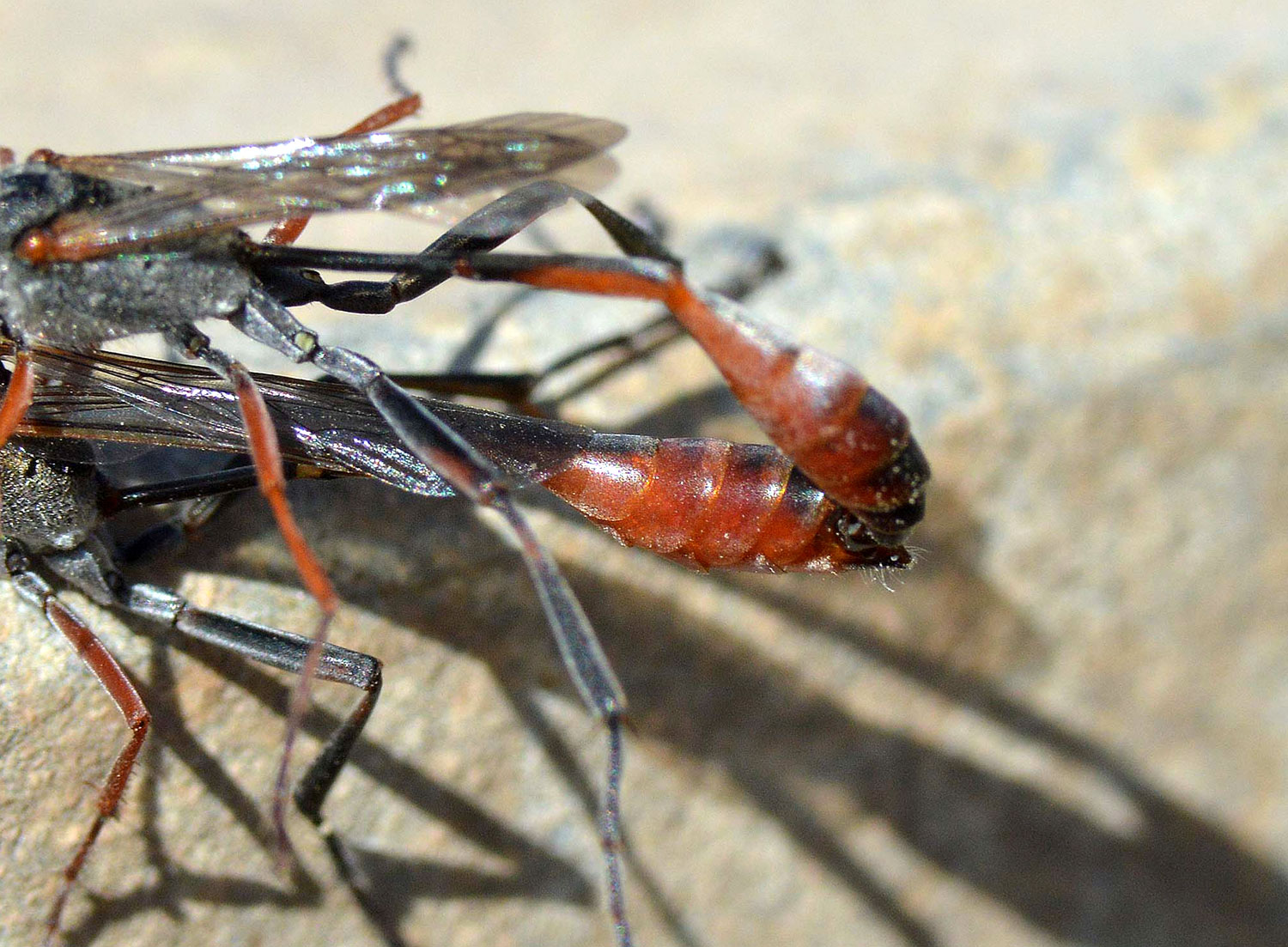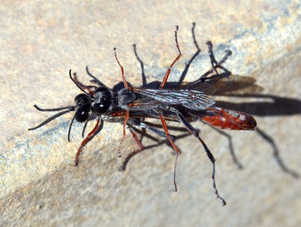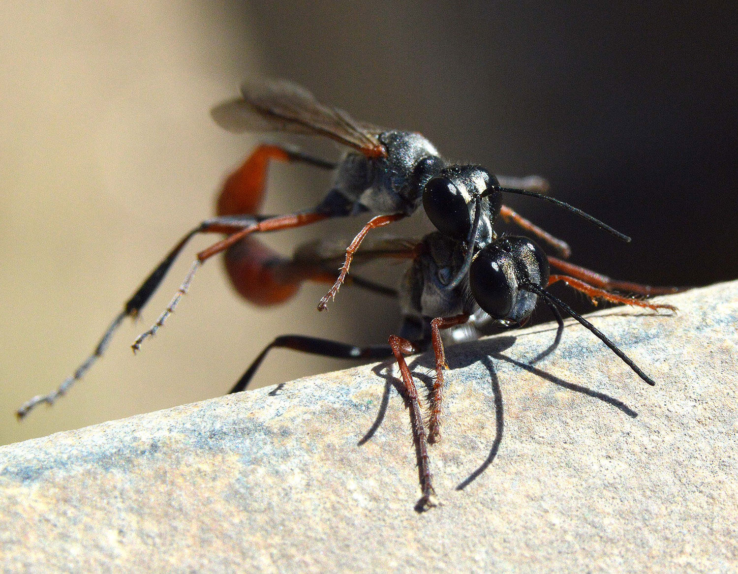 Otras especies de esta familia excavan la celda en el suelo. Este es el caso de las avispas que se pueden ver en las imágenes. Se trata de un macho y una hembra del género Ammophila que están realizando la cópula. No es fácil hacer una fotografía a estas avispas porque no paran quietas. Anduve un rato tras de ellas sin suerte. Y cuando estaba a punto de desistir, vi esta pareja. Cuando los insectos realizan la cópula es un buen momento para tomar fotos. Aguantan más la intromisión.