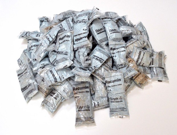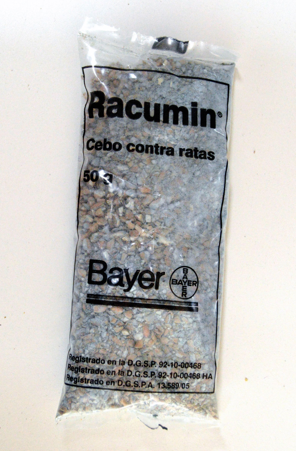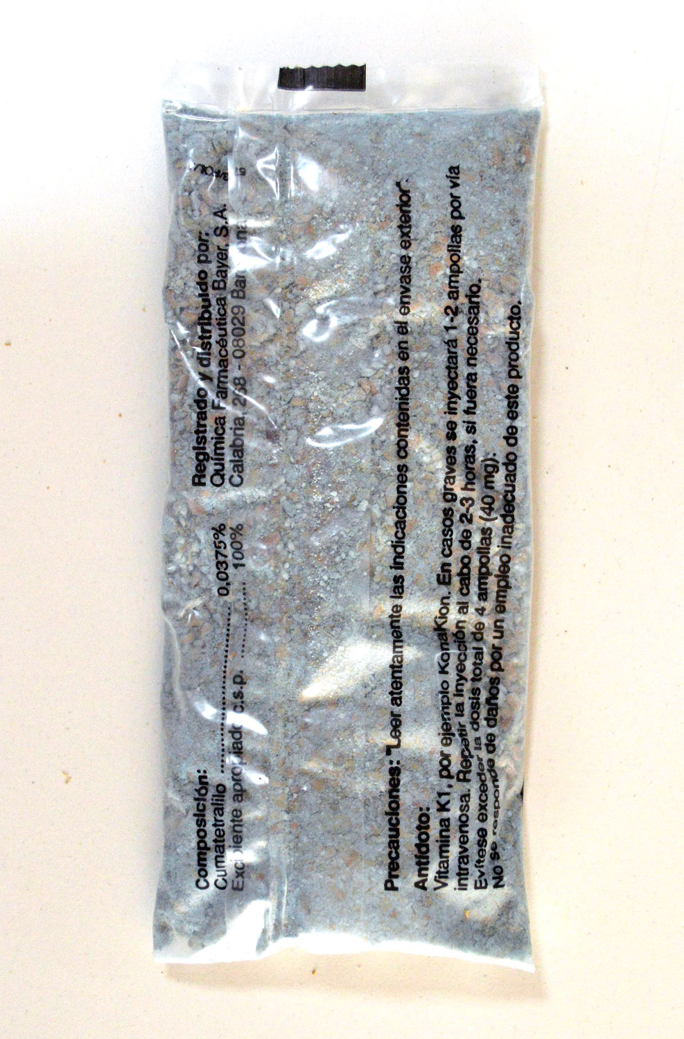 Hace pocos días un compañero llegó con un montón de bolsitas de raticida antiguas. Eran bolsitas de 50 gramos de Racumin Cebo con registro de 1992 [1]. Un cliente las tenía almacenadas en una caja desde hacía mucho. Calculo que llevaban guardadas cerca de 20 años. Las entregó para que fueran gestionadas debidamente. Con una tercera parte de las bolsitas, hice la montaña de la imagen número 1. Luego tomé imágenes del anverso y del reverso de la etiqueta (figuras 2 y 3). Como es sabido, Racumin es una marca que Bayer creó para comercializar cebos raticidas formulados con cumatetralilo, una materia activa anticoagulante de primera generación desarrollada por esta misma casa germana en la década de 1950. Pero no fue hasta la década de 1970 que fue introducida la marca en España.