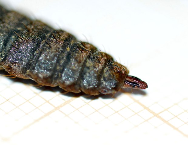 Al observar las larvas, vi que se movían de forma torpe. Ya estaban casi a punto de entrar en el estadio de pupa. La larvas medían unos 2 centímetros y medio aproximadamente, tal y como se puede ver en la imagen número 2. Me resultó interesante la cabeza de la larva. Muy pequeña y estrecha en comparación con el resto del cuerpo. Aunque esto es típico en larvas de otras especies de la familia Stratiomyidae. Cuando llegué a casa, las puse en un frasco cubierto con tela mosquitera. Y anteayer, a las 10 horas de la noche salió el primer adulto (figuras 10 y 11). Y tras esta salió otra, la de la imagen número 1. No he podido observar de momento cómo salen de la pupa. Pero sí cómo queda la cutítula. En la imagen número 9 se puede ver que al presionar la mosca para salir, se rompe la cutícula entre el primer y segundo segmento, por lo que sería el tórax.