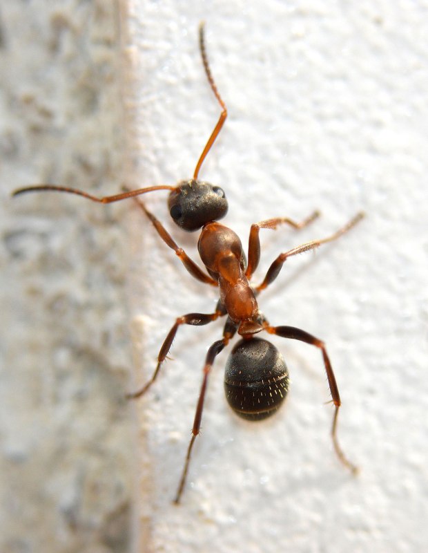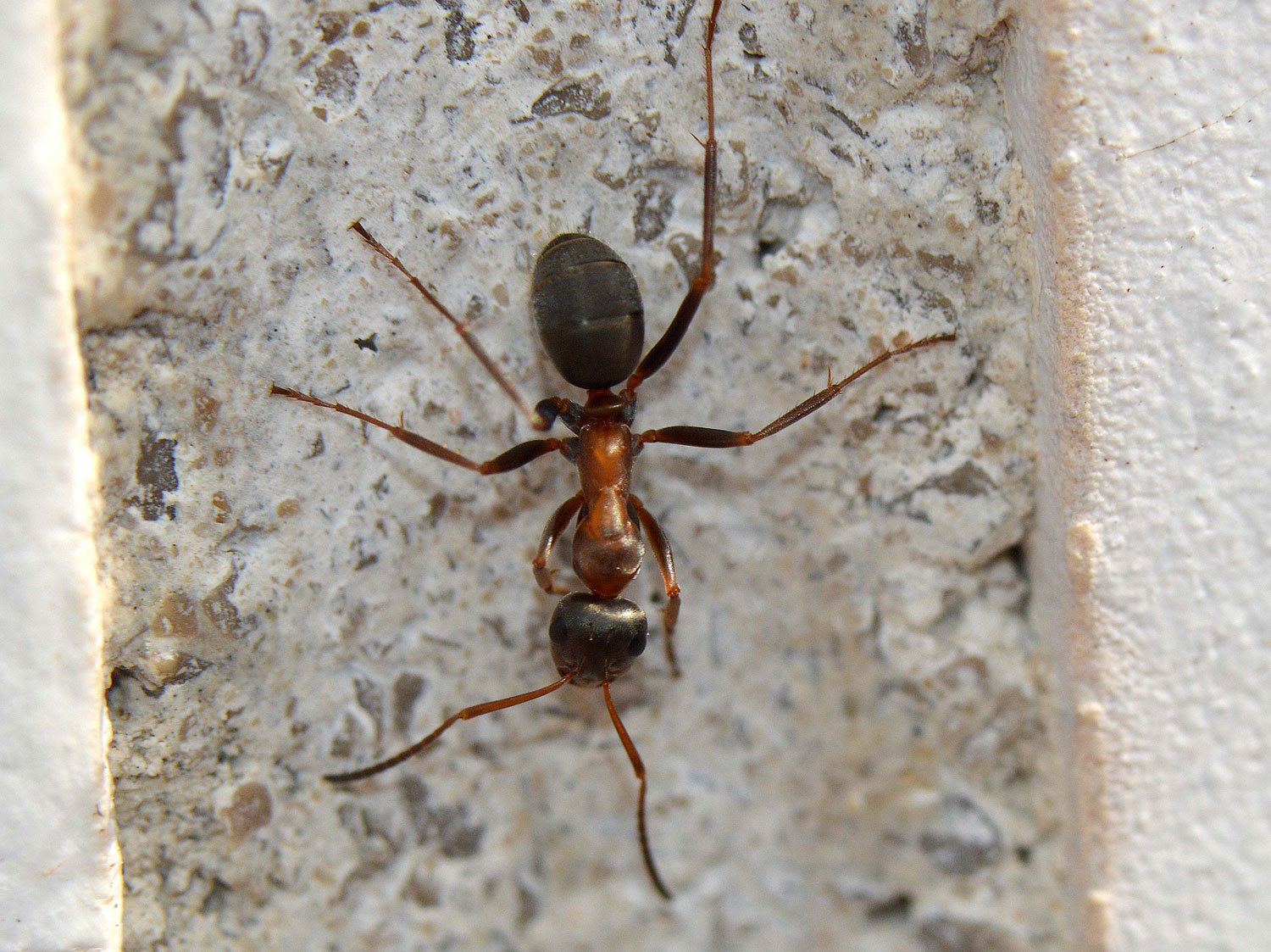Intenté tomar fotografías, pero no era fácil. Me fijé que eran prudentes. Miraban de esquivar a otras hormigas. En la zona había especies más pequeñas del género Lasius y Tetramorium. Al toparse con alguna obrera de estas especies, se apartaban rápidamente. Parecía como que rebotaran. Las vi subirse por una pared y aproveché para fotografiarlas, ya que parecían más quietas (figuras 3 y 4). Si se topaban con obreras de otras especies, las ganas de esquivarlas hacía que en ocasiones cayeran hacia el suelo.