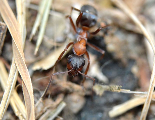 Después de muchos días de buena voluntad pensando en dedicarme un rato a observarla, ayer tarde decidí hacerlo. Cogí la cámara y un poco de cebo líquido para ofrecérselo a alguna obrera. Y de esta manera, al quedarse quieta sorbiendo, podría acercar el objetivo macro y tomar algunas fotografías. Y así lo intenté. Ofrecí el cebo dulce a varias obreras, pero no hicieron ni caso. Entonces cogí una obrera y vi que pertenecía al género Formica. Un grupo interesante de hormigas, porque algunas especies levantan hermosos montículos con hojas y palitos.
