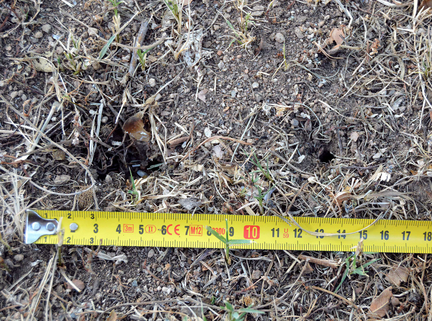 También observé que debían tener buena visión, porque al agacharme y acercarme a ellas, huían o se escondían bajo cualquier cosa que hubiera en la calle como una hoja o una ramita. Busqué el hormiguero. Para ello decidí seguir a alguna que llevara algo en las mandíbulas (figura 1). Vi que se dirigían hacia un parterre con césped. Entonces observé que las que se encontraban en el margen del parterre, si me acercaba, corrían a esconderse bajo la hierba. Esto me hizo pensar que que esta especie de Formica no está adaptada del todo a la vida sobre el pavimento o sobre un erial. No se siente cómoda en zonas donde no hay plantas que la cubran. Lógicamente, su gran tamaño le invita a protegerse. En el parterre encontré varios hormigueros. En las imágenes 8 y 9 se pueden ver las entradas de un par de ellos.