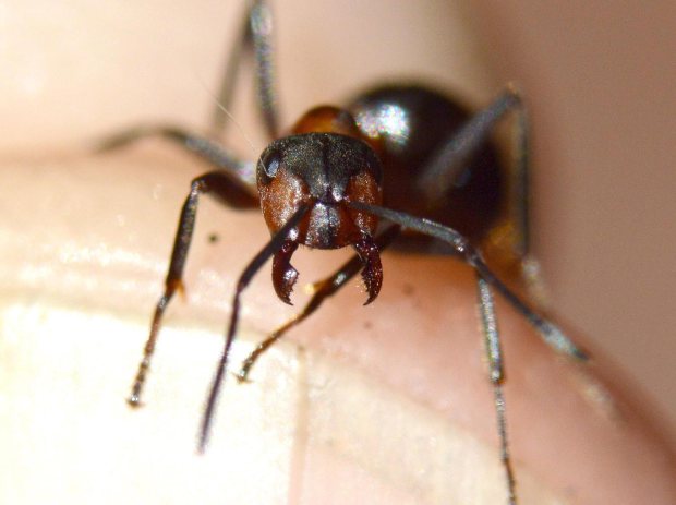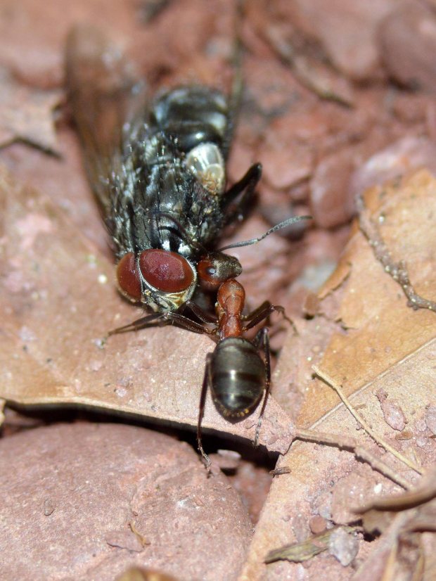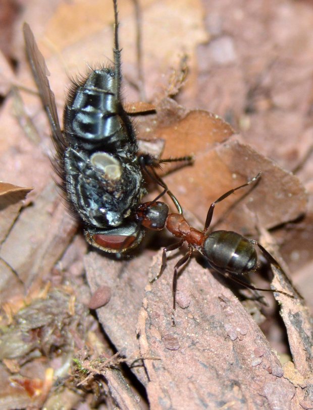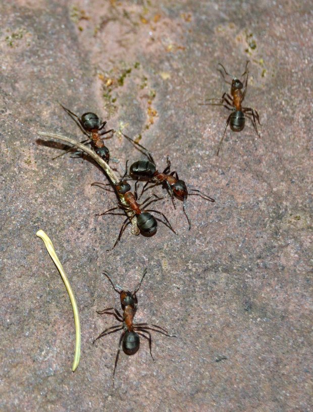 Pedí a mi mujer que se situara junto al montículo como referencia (figura 3). Y luego con un metro medí la base (figura 4). Calculé que de largo medía 1,5 metros. Y de alto unos 80 centímetros. Sobre el montículo había gran actividad (figura 5). En especial, cerca de las entradas (figuras 6 y 7). Llegaban obreras con acículas y palitos para agrandar el hormiguero (figura 8). Y también con gran número de presas (figura 9 y 10). Las hormigas que construyen montículos son expertas buscadoras de alimentos. Cualquier insecto que entre en su territorio, si no tiene cuidado, será capturado y transportado al hormiguero. Y también buscan árboles con áfidos para alimentarse de la melaza que segregan. Limpian muy bien el terreno resguardando los árboles de plagas perjudiciales. Además, son agresivas y luchan palmo a palmo con hormigueros vecinos.