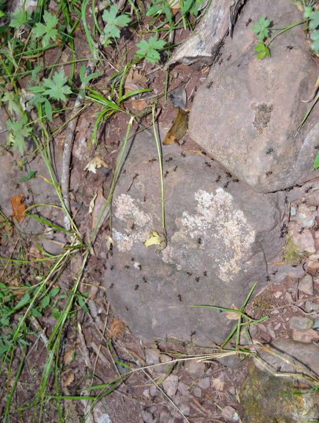 Anduve con cuidado, pues estas hormigas se molestan por nada y se le suben a uno encima rápido. Además, son capaces de rociarte con ácido fórmico. En diversas direcciones partían caminos repletos de obreras (figuras 11 y 12). Estos caminos se distinguían bien, pues no crecían las plantas. Una colonia de Formica rufa puede contener un gran número de obreras, ya que cuenta con muchas reinas trabajando por hacerla crecer (poliginia). Para alimentar tal cantidad de hormigas es necesario que el terreno de forrajeo sea grande. Se calcula que pueden llegar hasta 100 metros a la redonda. A unos 3 metros del montículo corría el río Espata, lo cual limitaba de forma natural el territorio. Al regresar de nuevo al punto de partida, por el camino encontré otro montículo de Formica sp debajo de una zona donde abundaban las hayas (figuras 15 y 16). Aunque este se encontraba abandonado.