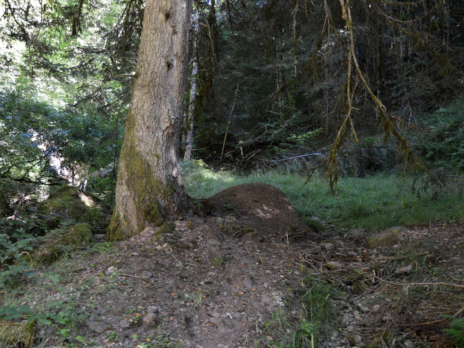 Me entretuve durante el camino observando la naturaleza que me rodeaba. En el llano abundaban los abetos. Pero en el ascenso, al adentrarnos en la zona de umbría abundaban las hayas. Con la mirada atenta al suelo, busqué a ver qué especies de hormigas encontraba. En un tocón encontré hormigas del género Lasius de las que daré cuenta en otro posteo. Al llegar al barranco de Espata, vi debajo de un abeto y a la sombra un montículo de pinaza (figura 2). Me di cuenta de que se trataba de un hormiguero de Formica sp. Me hizo mucha ilusión. Me encantan las hormigas que construyen montículos. Las asocio a la alta montaña. De manera genérica se las denomina como «hormigas rojas». En general, son de gran tamaño. Miden entre 5 y 10 milímetros.