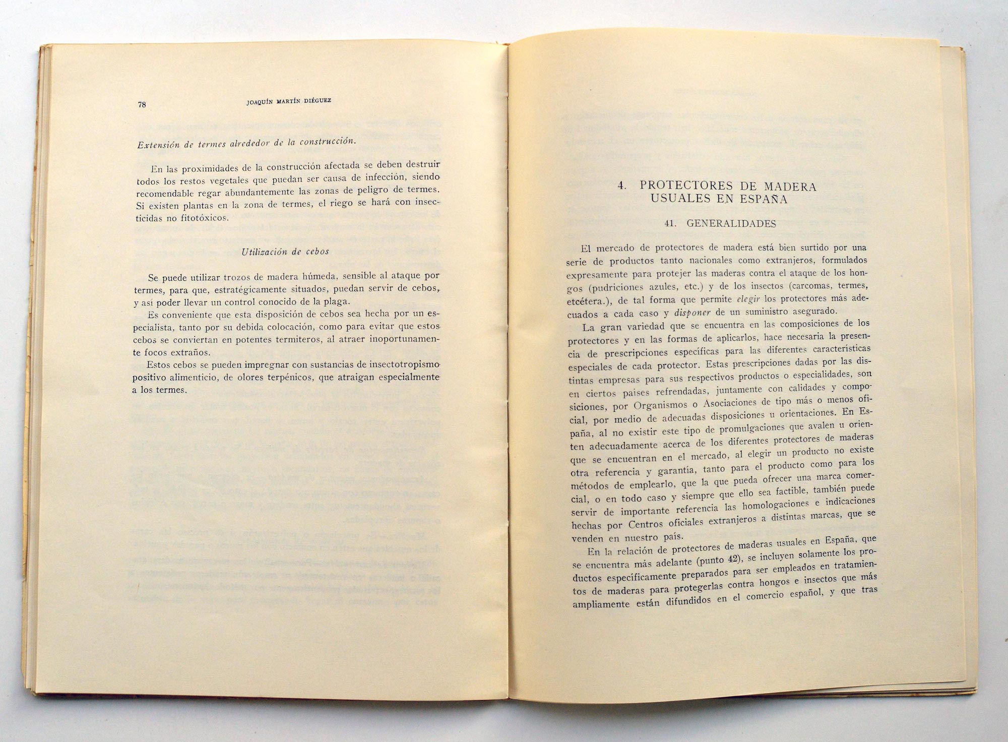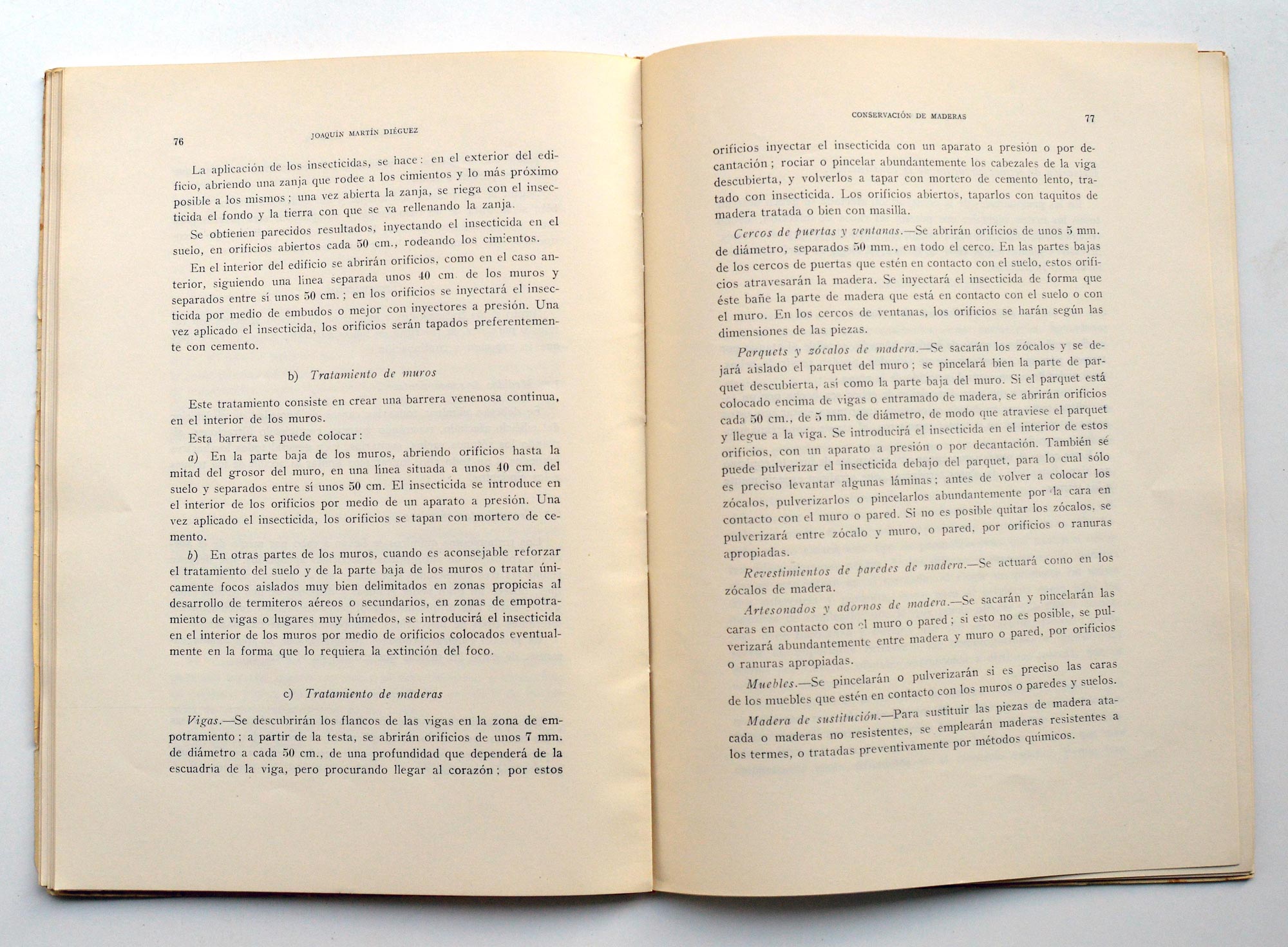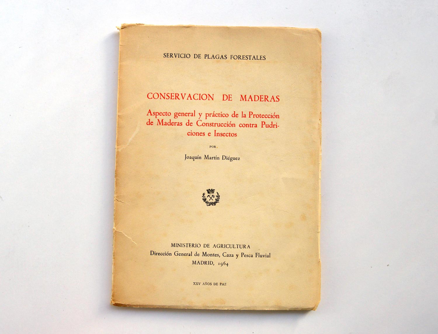 – J. Martín Diéguez. 1964. Conservación de maderas. Aspecto general y práctico de la protección de maderas de construcción contra pudriciones e insectos. Servicio de Plagas Forestales, Ministerio de Agricultura, Madrid. 116 pp. 24 x 17’5 cm. Depósito legal M. 14.947-1964.