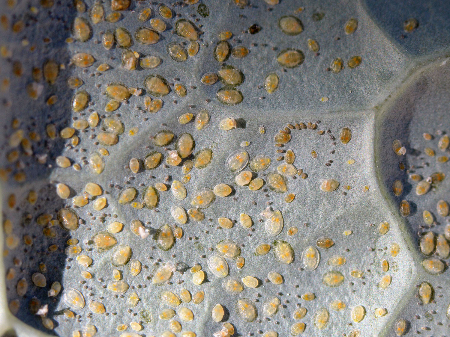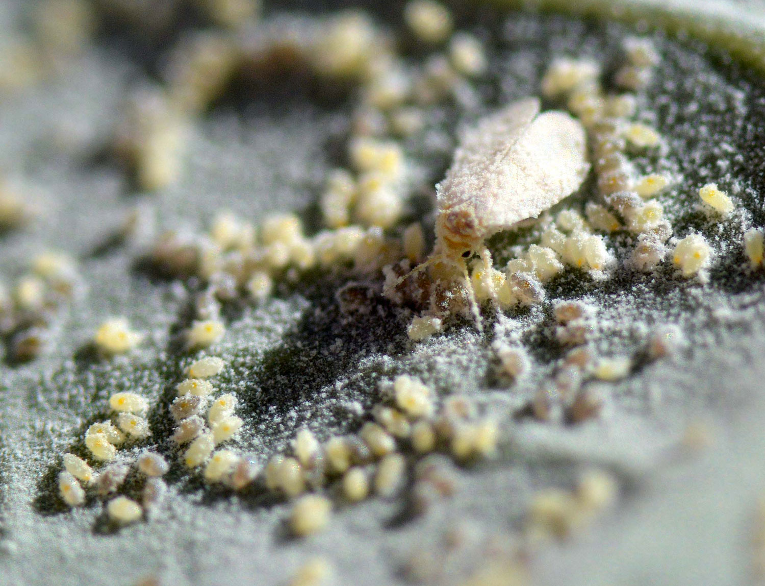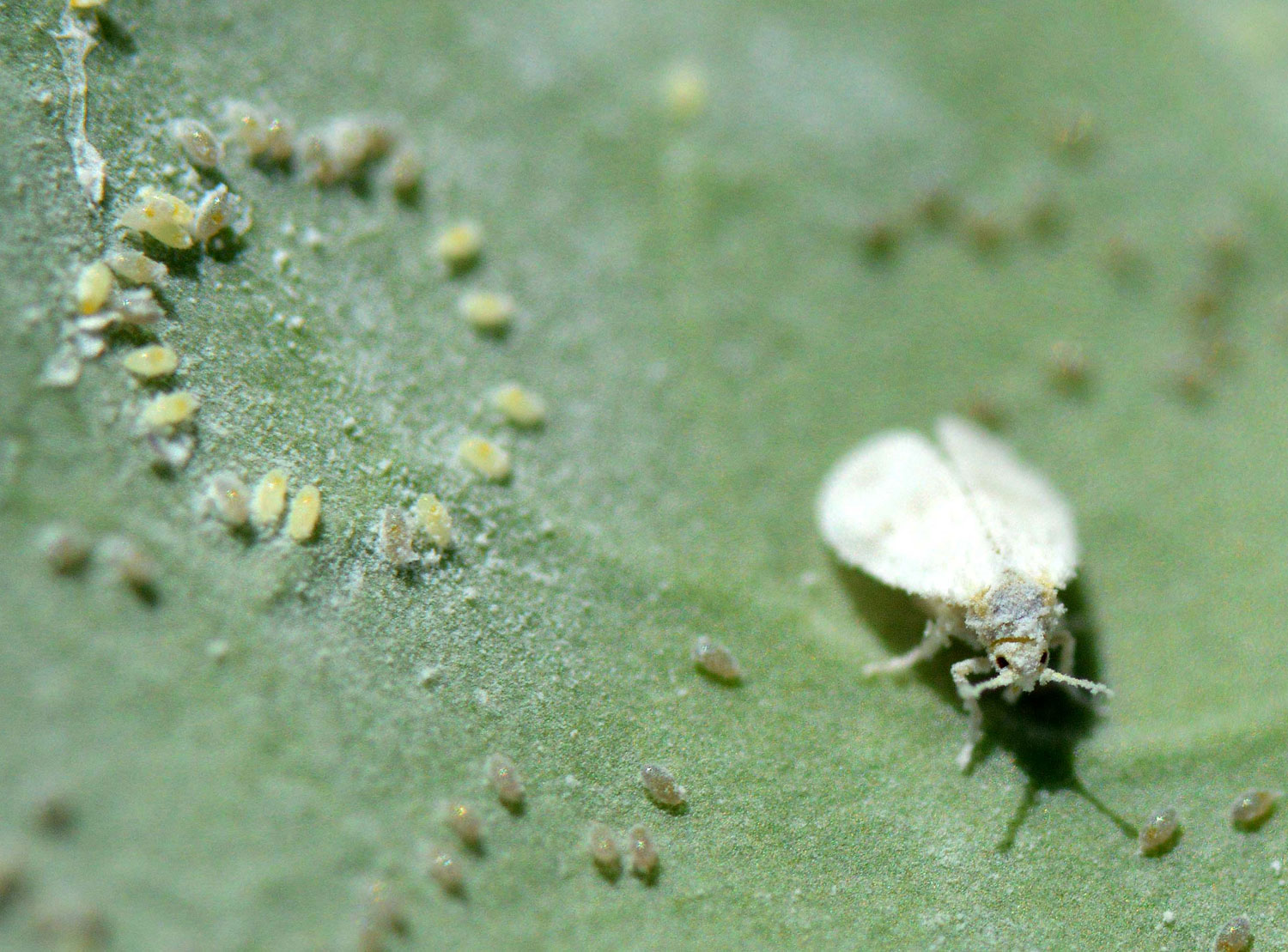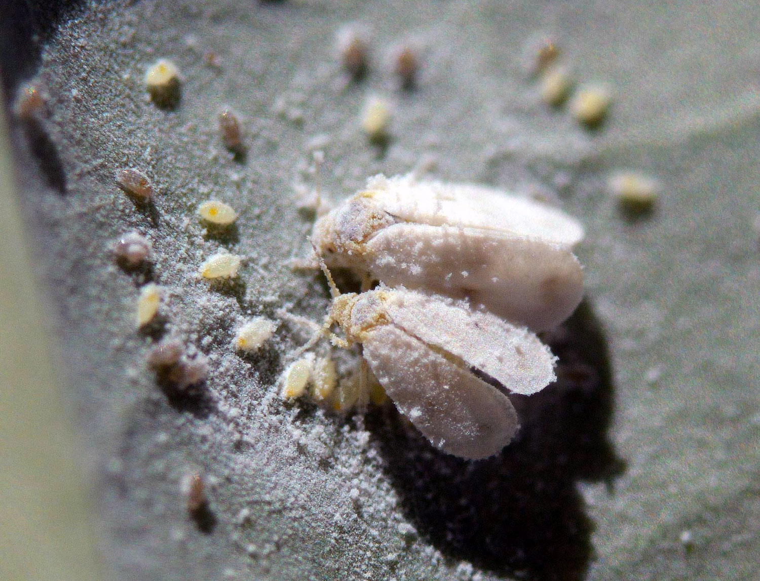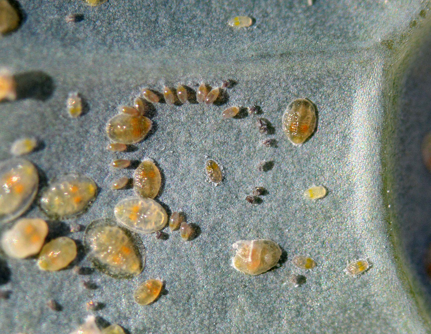 Encontré en un huerto, sobre lo que parecían crucíferas, gran cantidad de mosca blanca. Al levantar las hojas, se veía en el reverso huevos, larvas y adultos. Algunas plantas estaban muy infestadas. Hay que matizar el término mosca blanca, porque se trata de una etiqueta genérica para denominar a una gran cantidad de especies de la familia de los aleuródidos (Aleyrodidae). De lejos, los adultos de esta familia se parecen bastante. De cerca, uno puede intentar averiguar a qué género pertenecen gracias a la forma de las larvas. De hecho, cada especie de aleuródido está especializada en unas plantas concretas. A mí me parece que las moscas blancas de las imágenes pertenecen al género Aleyrodes.