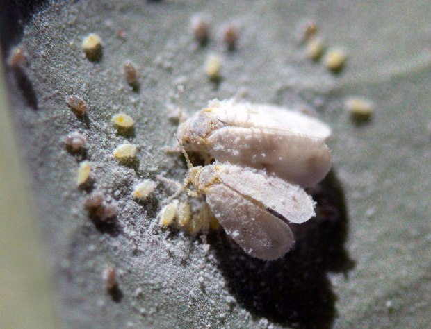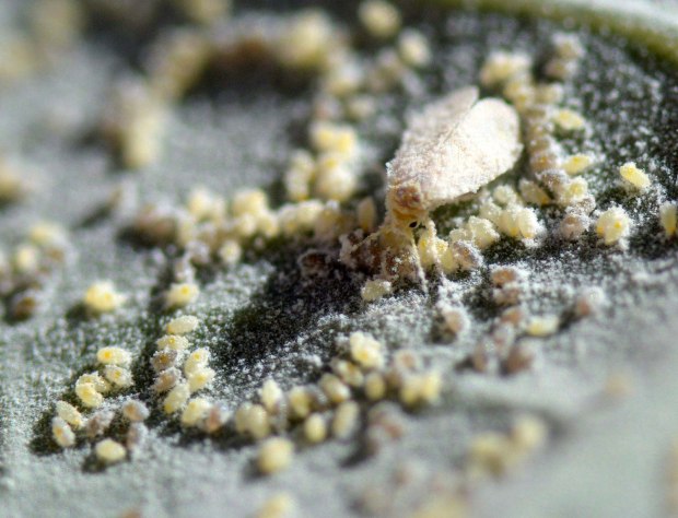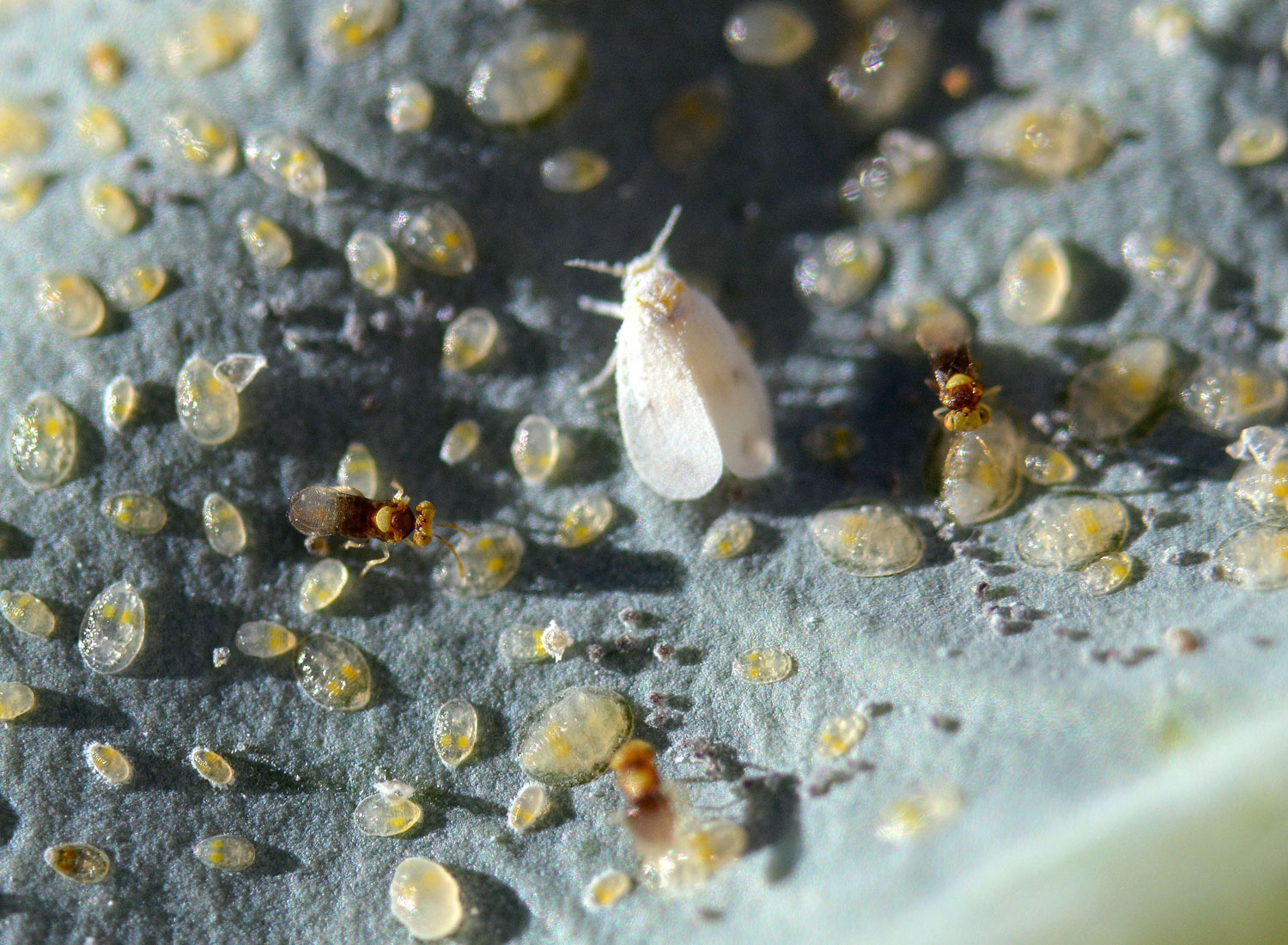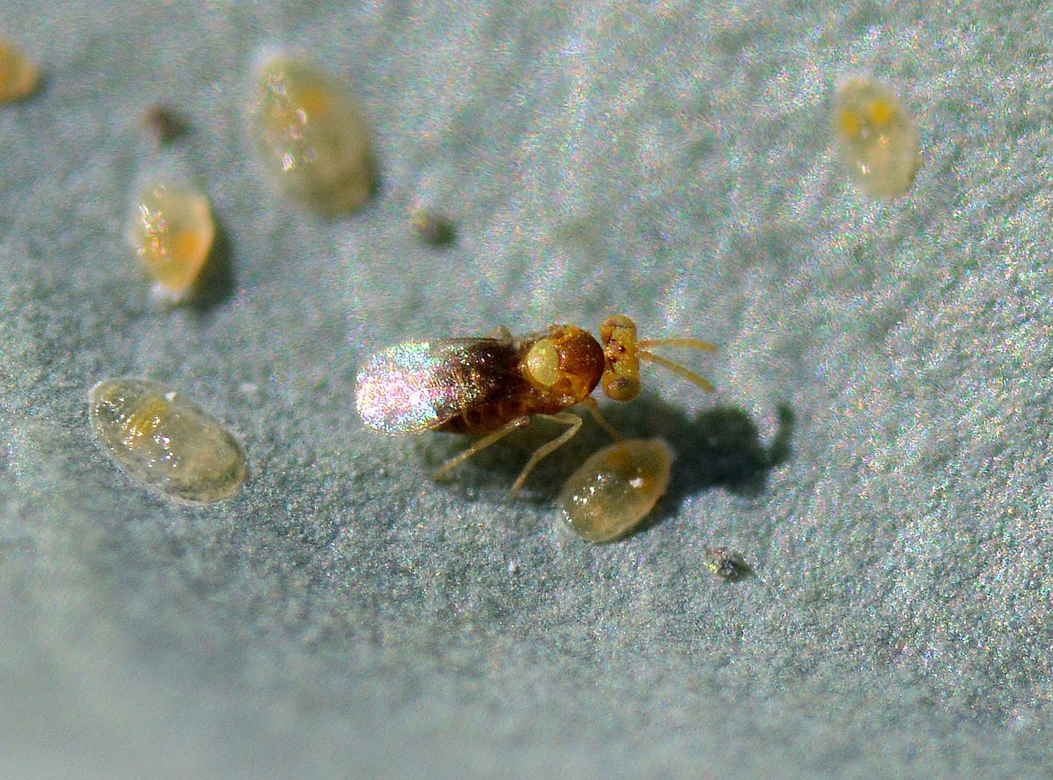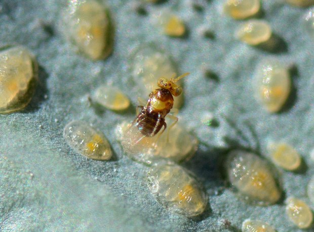 Cuando me puse a tomar fotografías con la ayuda del objetivo macro, descubrí unas pequeñas avispillas (figuras 11 a 15). Calculo que si los adultos de mosca blanca medían unos 2 milímetros (figura 16), estas avispillas no medían más de uno. Y vi que algunas se sentaban sobre las larvas. Parecían poner el culo (extremo del abdomen) justo encima. En una imagen (figura 15) pude ver que algo estaban inyectanto. Así pues, se trataba de un parasitoide que estaba haciendo su agosto a costa de la plaga. En casa he eso buscando de qué himenóptero podría tratarse de Encarsia sp. Estos parasitoides tienen todo lo que se necesita de las moscas blancas. La hembra deposita los huevos en el interior de las larvas. Y además obtiene el alimento de la melaza segregada por estas. Son muy efectivas, ya que además la hembra no necesita estar fecundada por el macho para poder realizar la puesta (partenogénesis). Caso curioso es que el macho, el cual es escaso, puede ejercer de hiperparásito si el número de hembras es muy elevado [1].