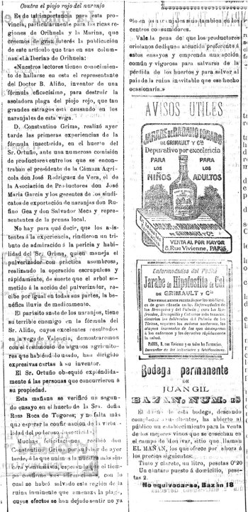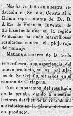 En las imágenes 1 y 2, se pueden ver dos recortes de marzo de 1909. Se puede leer la mención más antigua que he encontrado de Constantino Grima. Aparece como representante del Doctor B. Aliño de Valencia, el cual inventó una fórmula insecticida para destruir la plaga del piojo rojo del naranjo. Como se puede leer en el recorte del 2 de marzo de 1909 (figura 1), Constantino Grima tenía excelentes aptitudes comerciales. Se presentó en la redacción del periódico La Iberia para dar a conocer la prueba que iba a realizar al día siguiente en Orihuela con el novedoso insecticida. En el recorte del 7 de marzo (figura 2), aparecen descritas como exitosas las pruebas realizadas contra el piojo rojo del naranjo.