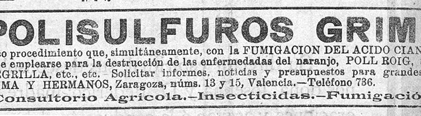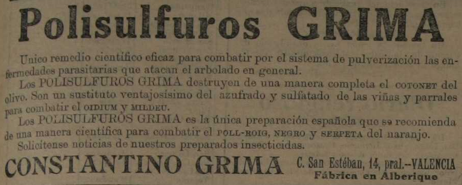 Se intuye que Constantino Grima devino una persona conocida en el mundo agrario de la época en levante español. Prueba de ello es que en junio de 1911, en el Diario de Valencia, fue publicado un anuncio publicitario de la empresa Polisulfuros Grima (figura 3), la cual comercializaba un insecticida a base de polisulfuros de cal que era descrito como «remedio científico eficaz para combatir por el sistema de pulverización las enfermedades parasitarias que atacan el arbolado en general». Es decir, Constantino Grima tuvo éxito comercializando el remedio del Doctor B. Aliño y, al ver la oportunidad de negocio, se estableció por su cuenta. Constantino Grima contaba en su haber contactos y clientes, y tenía talento para los negocios. Puso la fábrica de polisulfuros en Alberique, población cercana a Valencia. Hemos de entender que, en esos años, empezaba la guerra química contra las plagas que culminó con la creación de los organoclorados en la década de 1940.