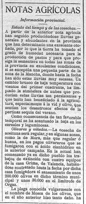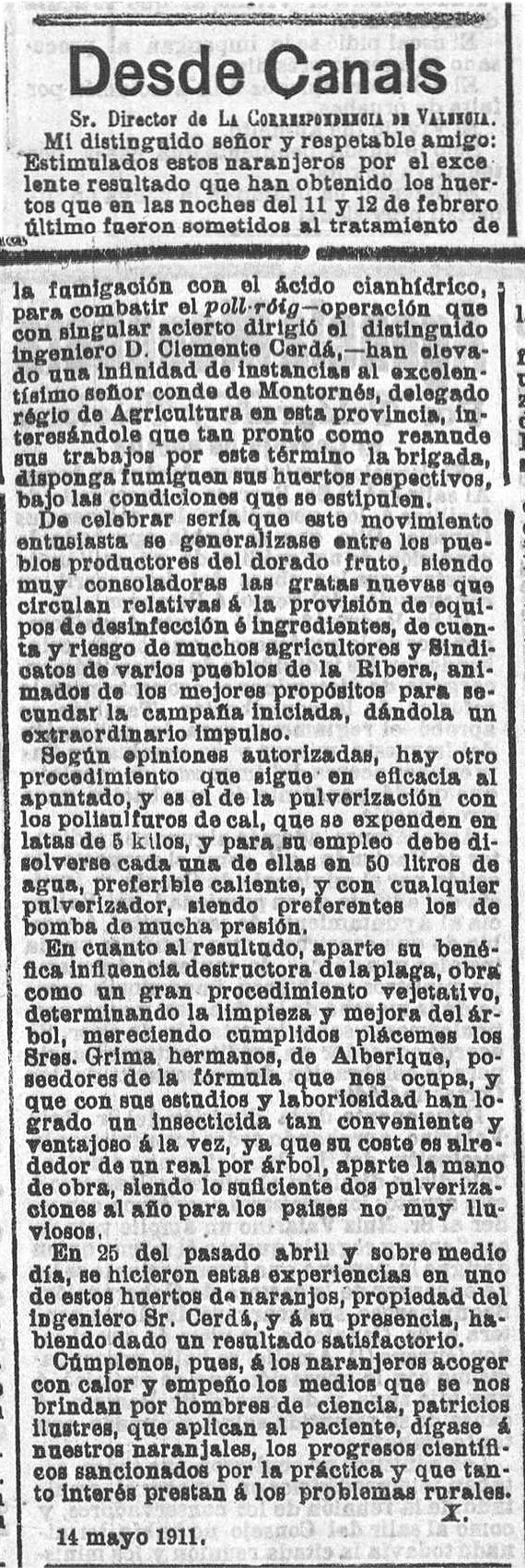 En 1911 se dio un hecho importantísimo para el mundo agrícola. Y fue la introducción del ácido cianhídrico para la fumigación de los naranjos. La aplicación de este gas en los cultivos venía avalada por el éxito conseguido en los naranjales de California a finales del s. XIX. En la imagen número 4, se puede ver una noticia de 1911 publicada en La Correspondencia de Valencia, en la que se explica que el ingeniero Clemente Cerdá realizó tratamientos de prueba con ácido cianhídrico para el control del piojo rojo del naranjo. Los efectos de la fumigación fueron tan exitosos que los naranjeros querían disponer de todas las herramientas para poderlas realizar. En esta noticia se da cuenta también de manera amplia que, al procedimiento de la cianhidrización, sigue en eficacia la pulverización con polisulfuros de cal de los hermanos Grima de Alberique.