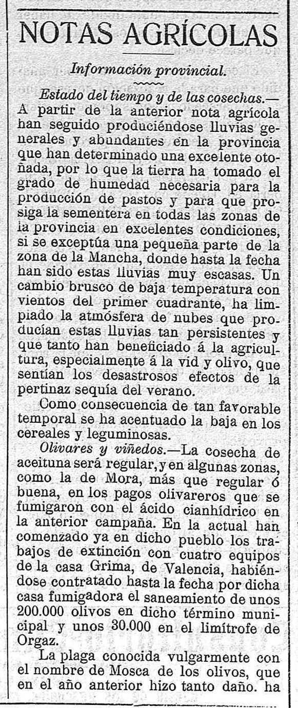 «Según nuestras noticias la misma empresa industrial está construyendo unas máquinas fumigadoras que producen el gas cianhídrico automáticamente, y cuyo gas, en la proporción que requiera, será aplicado a los distintos árboles en la cantidad exacta, sin pérdidas ni equivocaciones posibles y sin temor a los deterioros de las lonas por salpicaduras de ácido sulfúrico, ni peligro, que es lo más importante, para los operarios encargados de su manejo.»