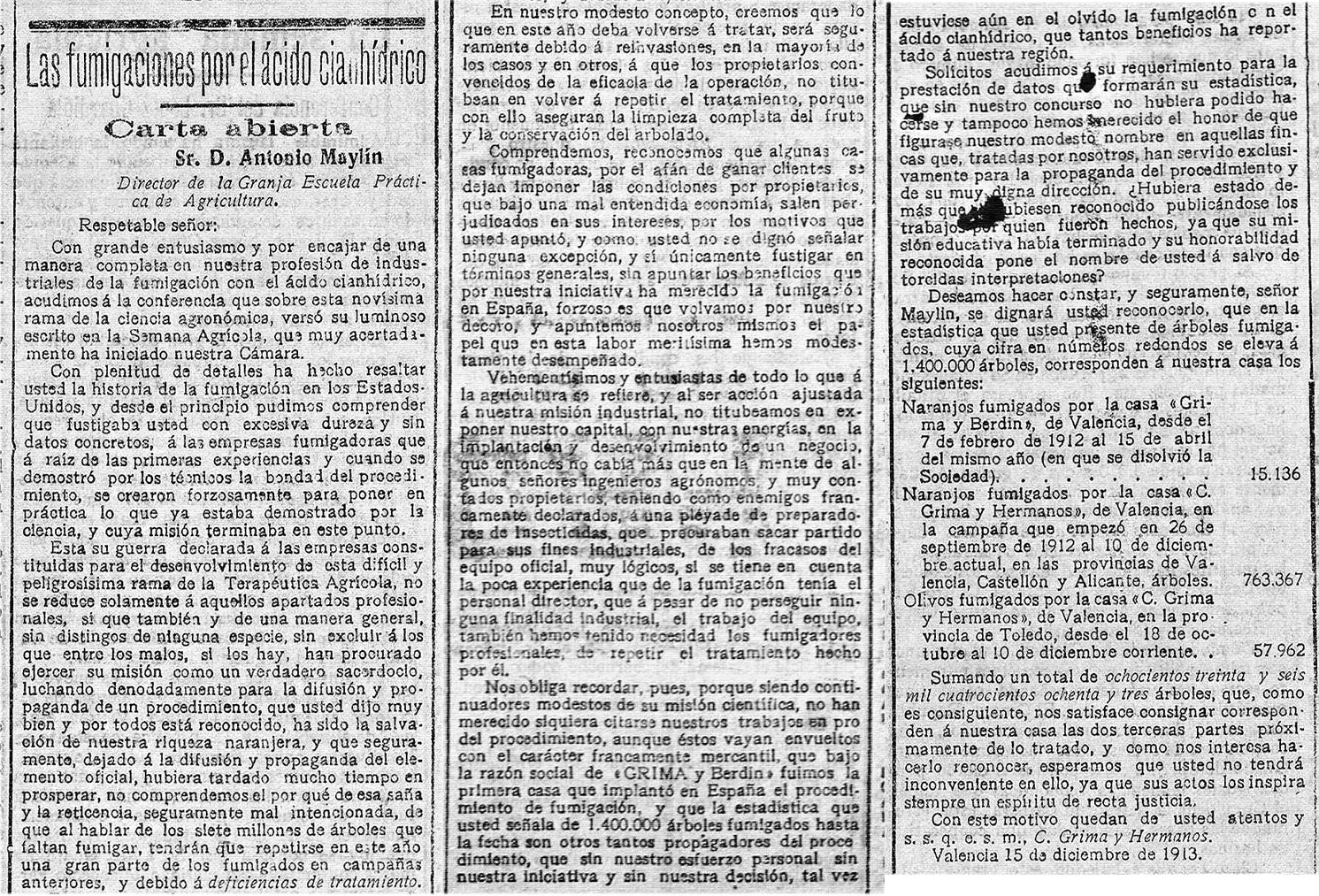 También de 1913 es una carta abierta que Constantino Grima dirigió a Antonio Maylín y que fue publicada en el periódico Las Provincias (figura 7). Es muy interesante porque saca pecho y reprueba a una personalidad importante de la época. Se trata del agrónomo y catedrático de agricultura Antonio Maylin Alonso (1849-1916). Parece ser que esta personalidad habló públicamente en una conferencia sobre el mal hacer de las casas fumigadoras que entonces utilizaban el ácido cianhídrico. Hay que apuntar que este gas es muy tóxico y debió producir un buen número de accidentes mortales de operarios. En su escrito, Constantino Grima se desmarca del resto de casas fumigadoras aduciendo la profesionalidad de Grima y Hermanos y que no se podía poner a todas las empresas en el mismo saco. Interesante es que menciona que el uso de la cianhidrización como una iniciativa suya. Esto no parece cierto del todo. Más bien había que hablar como uno de los introductores. Ahora bien, Constantino Grima vio pronto el negocio y  fue quien más uso le dio. Este hecho lo hace constar aduciendo con datos que, de 1.400.000 árboles tratados con ácido cianhídrico en España, 836.483 han sido tratados por Grima y Hermanos. Constantino Grima hace notar que Antonion Maylin conocía la importancia de su empresa y que la podía haber mencionado. En definitiva, se trata de un interesante escrito que muestra el fuerte carácter de Constantino Grima.