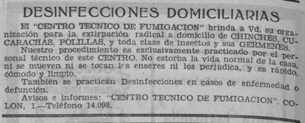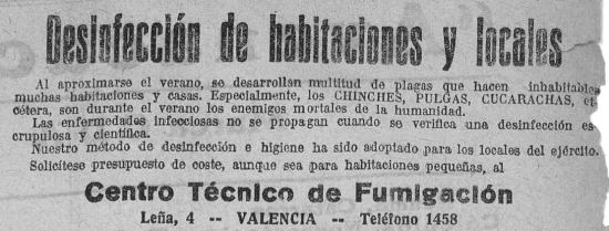 Era importante el hecho de desarrollar un aparato que permitiera un uso más seguro del ácido cianhídrico. Y la solución a ello debió llevar a Constantino Grima a ampliar el uso de este gas para otros usos más allá de la aplicación en árboles como es el caso de las plagas urbanas. No sé en qué año empezó a pensar en esta posibilidad. Pero he encontrado un anuncio de 1920 en el que Casa Grima ofrece servicios de desinsectación (figura 9). Lo considero el más antiguo publicado por una empresa de control de plagas. Se titula ‘Desinfección de habitaciones y locales’ y se ofrece contra chinches, pulgas, cucarachas y otras plagas. Era además un método garantizado y avalado, ya que «nuestro método de desinfección e higiene ha sido adoptado para los locales del ejército.» En este anuncio, Casa Grima tiene otra denominación más específica como Centro Técnico de Fumigación. Interesante denominación que daba cuenta del nivel técnico que se había desarrollado. El negocio marchaba y se expandía.