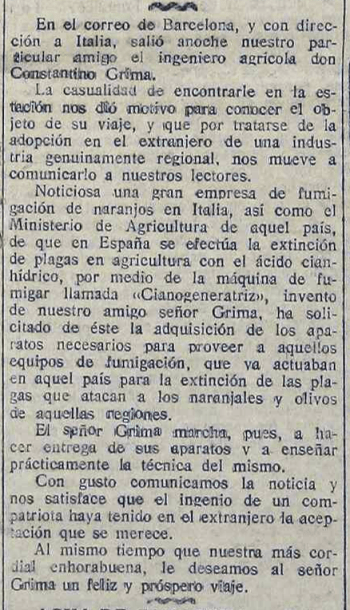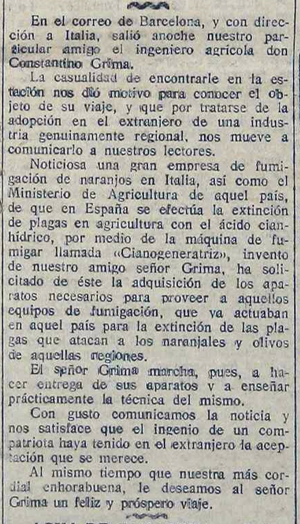 En la imagen número 10, se puede leer una noticia sobre un viaje que Constantino Grima realizó a Italia para vender sus máquinas generadoras de gas para fumigar naranjos y olivos. Y en el anuncio publicitario de la imagen número 11, se puede ver el aspecto de la máquina cianogeneratriz. Este anuncio fue publicado a toda página en 1922 en la revista Sanidad Militar. Y fue publicado el mismo durante unos años en la misma revista, la cual era leída por un importante cliente como era el Ejército. Constantino Grima entendió que la Administración, además de ser un buen cliente, le aportaría prestigio.