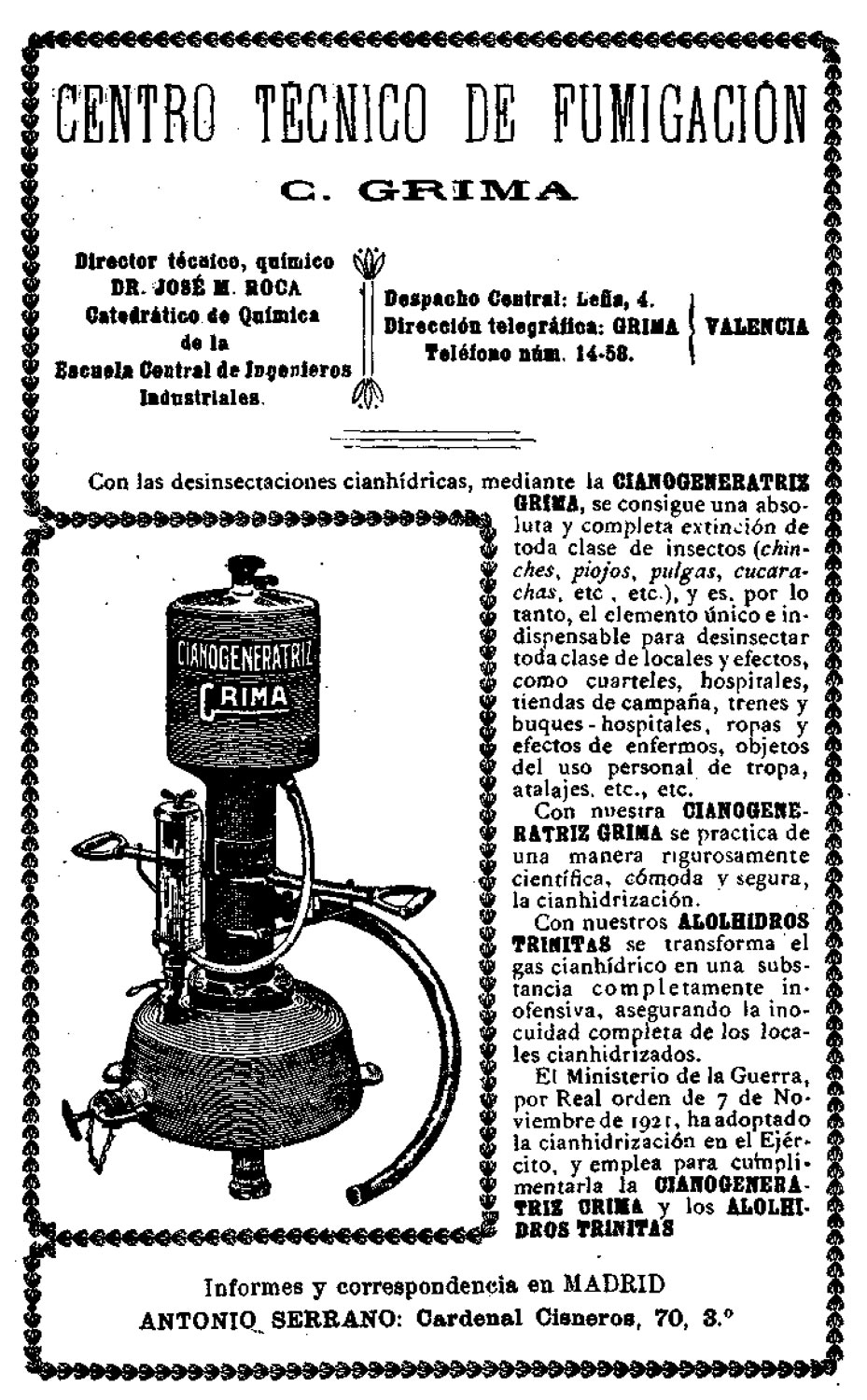 Sobre Casa Grima sí existe bastante información al respecto. Llegó a ser una empresa muy importante que desarrolló métodos propios de desinsectación y desratización basados en el uso del ácido cianhídrico. Además, destinó importantes recursos al apartado publicitario y a publicar documentación propia [6]. Todo ello es sin duda es un reflejo de cómo debía ser su fundador, ya que dominó la tecnología de la época para buscar soluciones, tuvo la iniciativa de iniciar un negocio que expandió por todo el país y dominó el marketing dándose a conocer y haciéndose con importantes contratos.