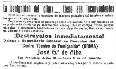 En la imagen número 12, un anuncio de 1923 da cuenta del alcance del uso del ácido cianhídrico por el Centro Técnico de Fumigación SA. Se anuncia su uso por la Administración en puertos y fronteras, en cuarteles y cárceles. Y también para la desinsectación de coches de ferrocarril, hoteles, casas particulares, almacenes, etc. Y todo este alcance significaba trabajo por hacer allí donde fuera necesario. Casa Grima expandió su actividad por toda España. Se abrieron delegaciones en las ciudades destacadas. En la imagen número 13, se puede ver un anuncio publicitario publicado en 1925 en La Gaceta de Tenerife.
