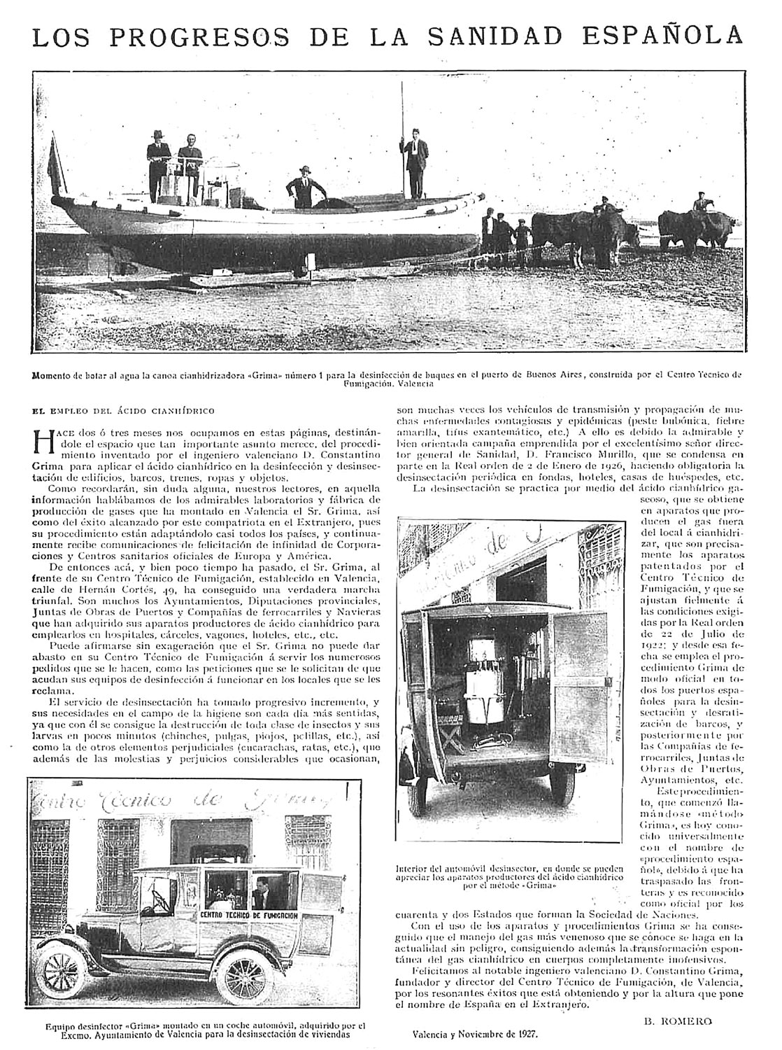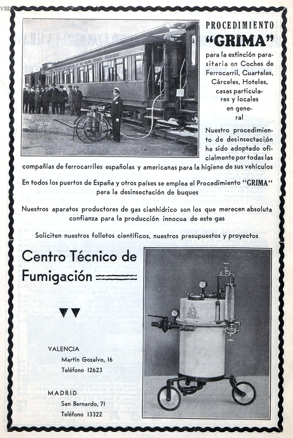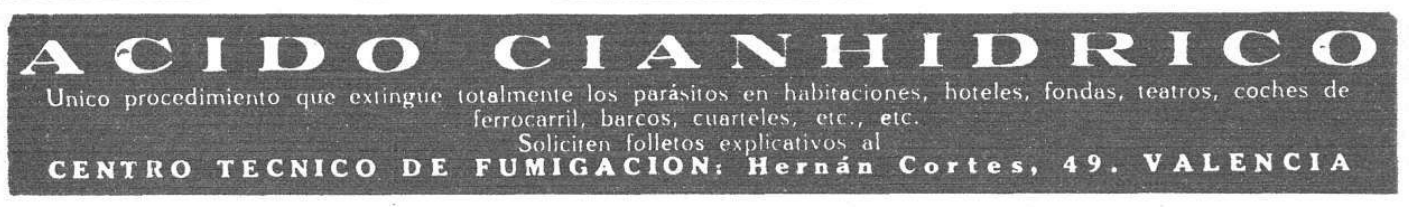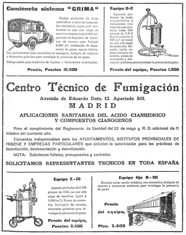 [6] C. Pradera. 09-10-2013. ‘Aplicaciones sanitarias por el ácido cianhídrico’ por Centro Técnico de Fumigación Casa Grima (1927). El desinsectador y desratizador.