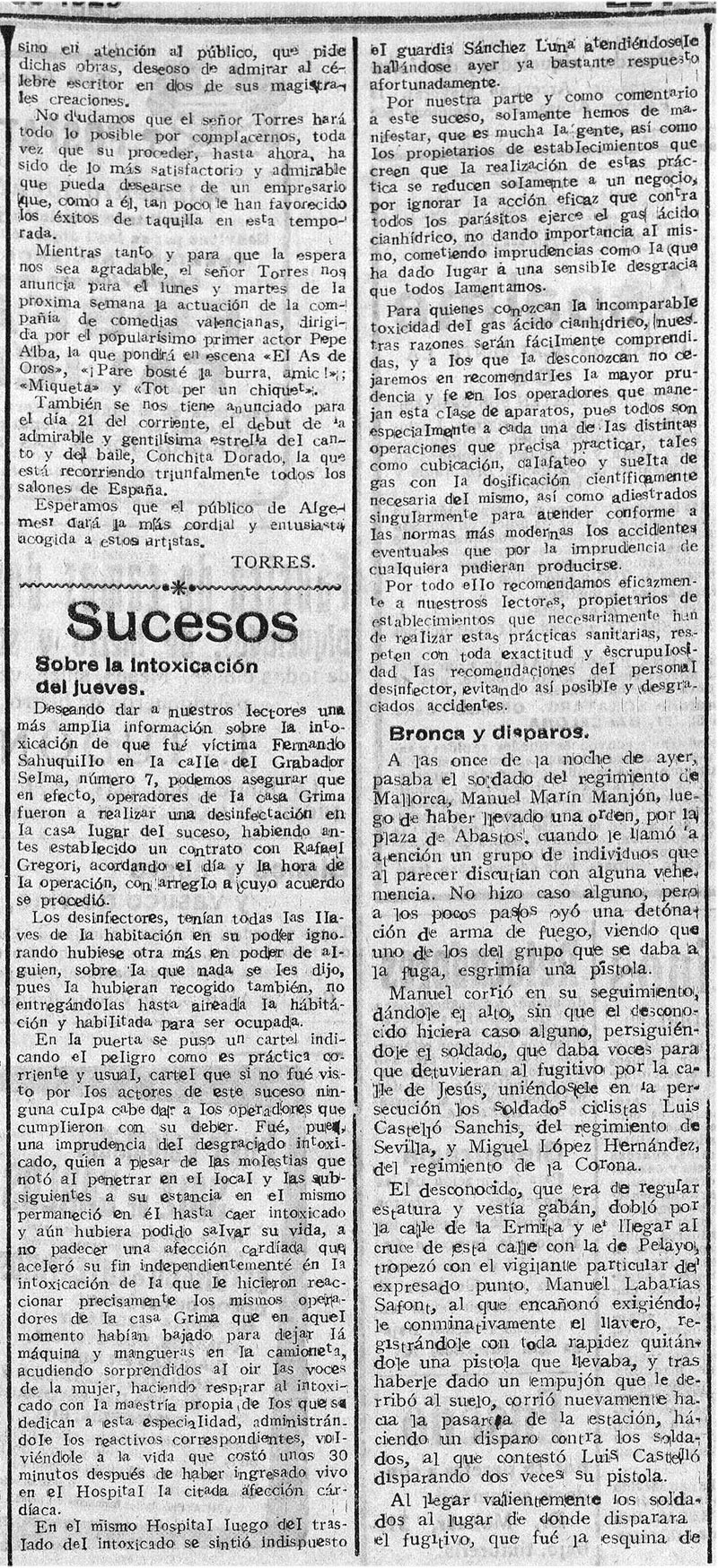 De 1916, he encontrado un artículo muy interesante publicado en el semanario La Vega de Orihuela (figura 8). Se titula ‘La fumigación con el ácido cianhídrico’. Se puede leer una breve reseña histórica de este procedimiento y de su introducción en España. Al final del artículo, se menciona a la Casa Constantino Grima y Hermanos como la más importante en el uso del gas, lo cual sirve para realizar una buena publicidad. En el último párrafo, se puede encontrar un importante dato: