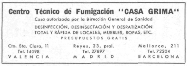 Y hasta aquí llega este artículo sobre los inicios de Casa Grima. Además de los recortes de prensa que he expuesto, he hecho acopio de otros que pongo a disposición en esta entrada para quienes tengan curiosidad. Véanlos más abajo. Dan cuenta de la importancia de esta empresa. Destaco el artículo de 1927 publicado en la importante revista Mundo Gráfico, en donde se da cuenta del uso del ácido cianhídrico para «la extinción de perros vagabundos» (figura 14). Y también destaco el publicado en Actualidad Española en 1932 sobre el uso del sistema Grima en vagones de ferrocarril y estaciones (figura 28). El último de todos es de 1942 (figura 30). Interesante es porque aparece el famoso «presupuesto gratis» que rige en el sector. Y que parece que viene de lejos. Y ya para finalizar, comentar que Casa Grima mantuvo siempre el negocio de productos plaguicidas para el agro. En la imagen número 31, se puede ver un anuncio de 1970 aparecido en la revista Agricultura.