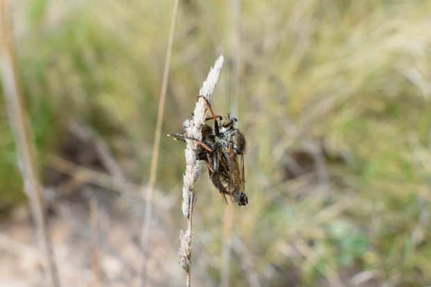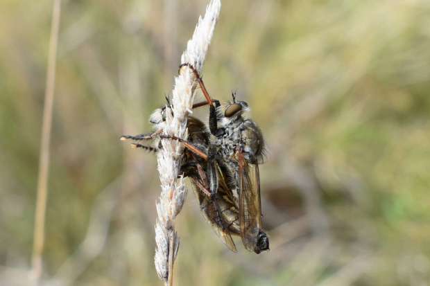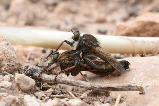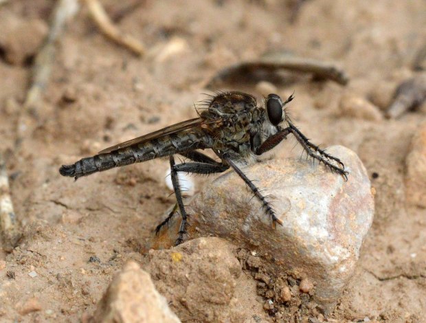 El pasado domingo encontré un indivifuo de Machimus cerca del embalse de Castellet de Foix, Barcelona. Se trata de una mosca perteneciente a la familia de los asílidos (Asilidae). Las moscas pertenecientes a esta familia son conocidas como moscas ladronas o moscas cazadoras. Son depredadoras de otras moscas a las que cazan con sus fuertes patas y que paralizan inyectando a través de su probóscide enzimas neurotóxicas. También inyectan a través de su saliva enzimas digestivas para luego poder sorber los nutrientes. En alguna ocasión he visto algún asílido con una víctima atrapada entre sus patas.