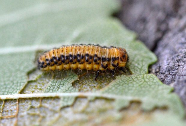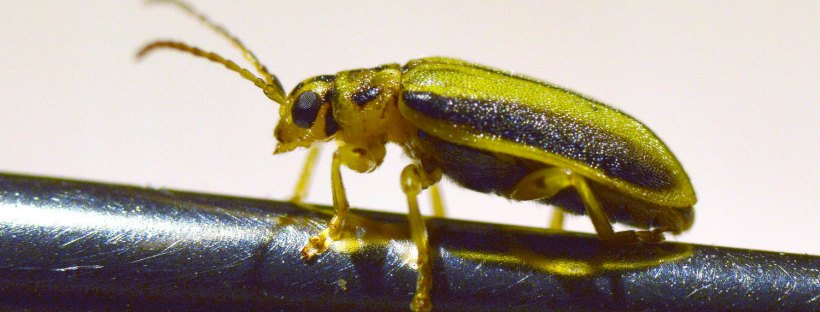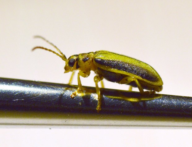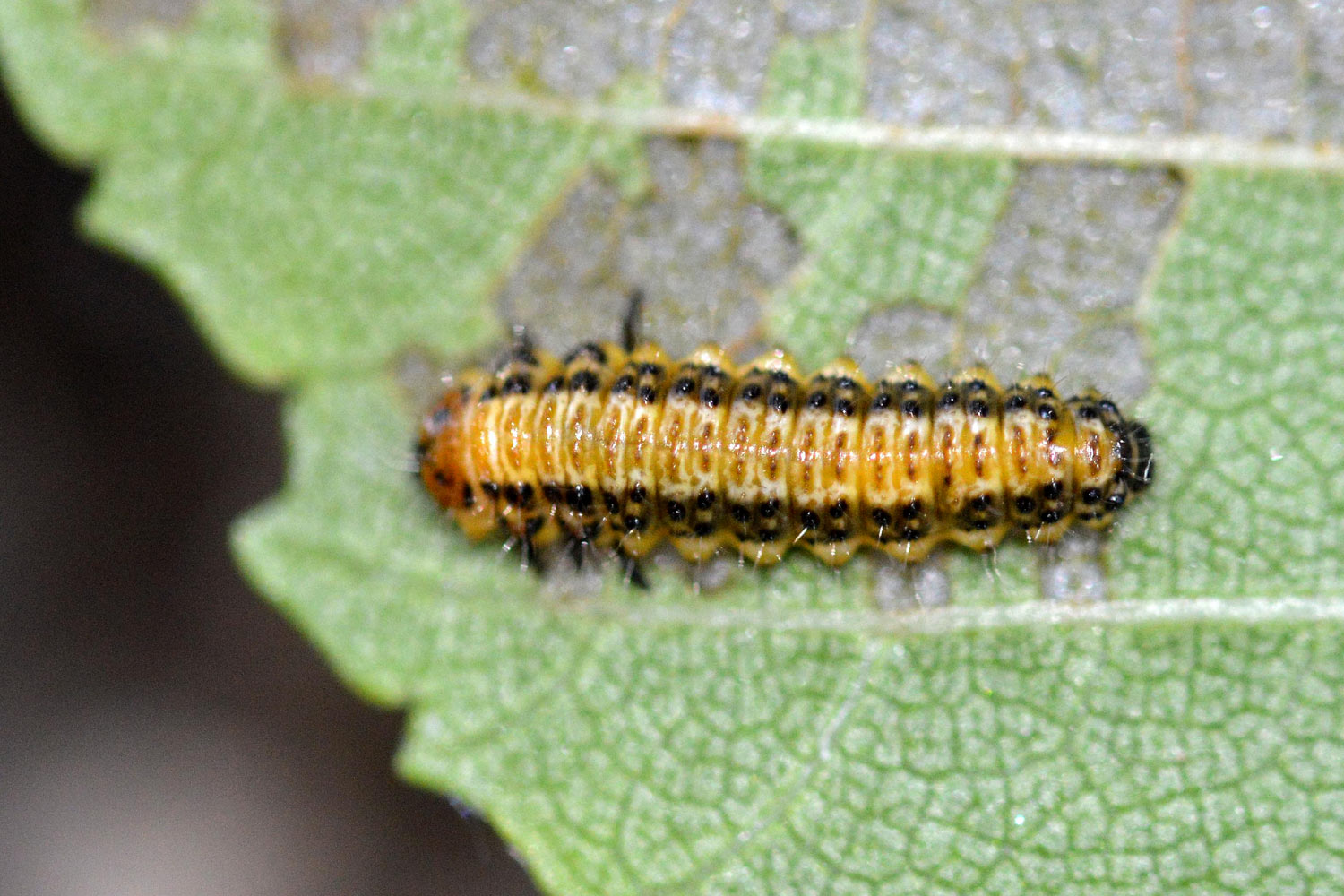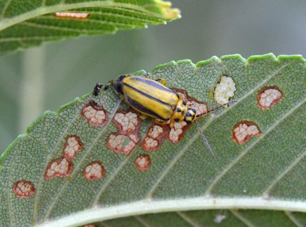Hace cosa de un par de semanas, aterrizó sobre el parabrisas de mi vehículo de trabajo un adulto de la galeruca del olmo (Xanthogaleruca luteola). Lo recogí y lo puse dentro de un frasco para observarlo tranquilamente en casa. Al regresar por la tarde del trabajo, pensé mirar en los olmos (Ulmus) que hay cerca de donde vivo. Aparqué el vehículo y estuve un rato investigando. Encontré algunos ejemplares adultos y algunas puestas sobre el reverso de las hojas. Pero no encontré larvas.