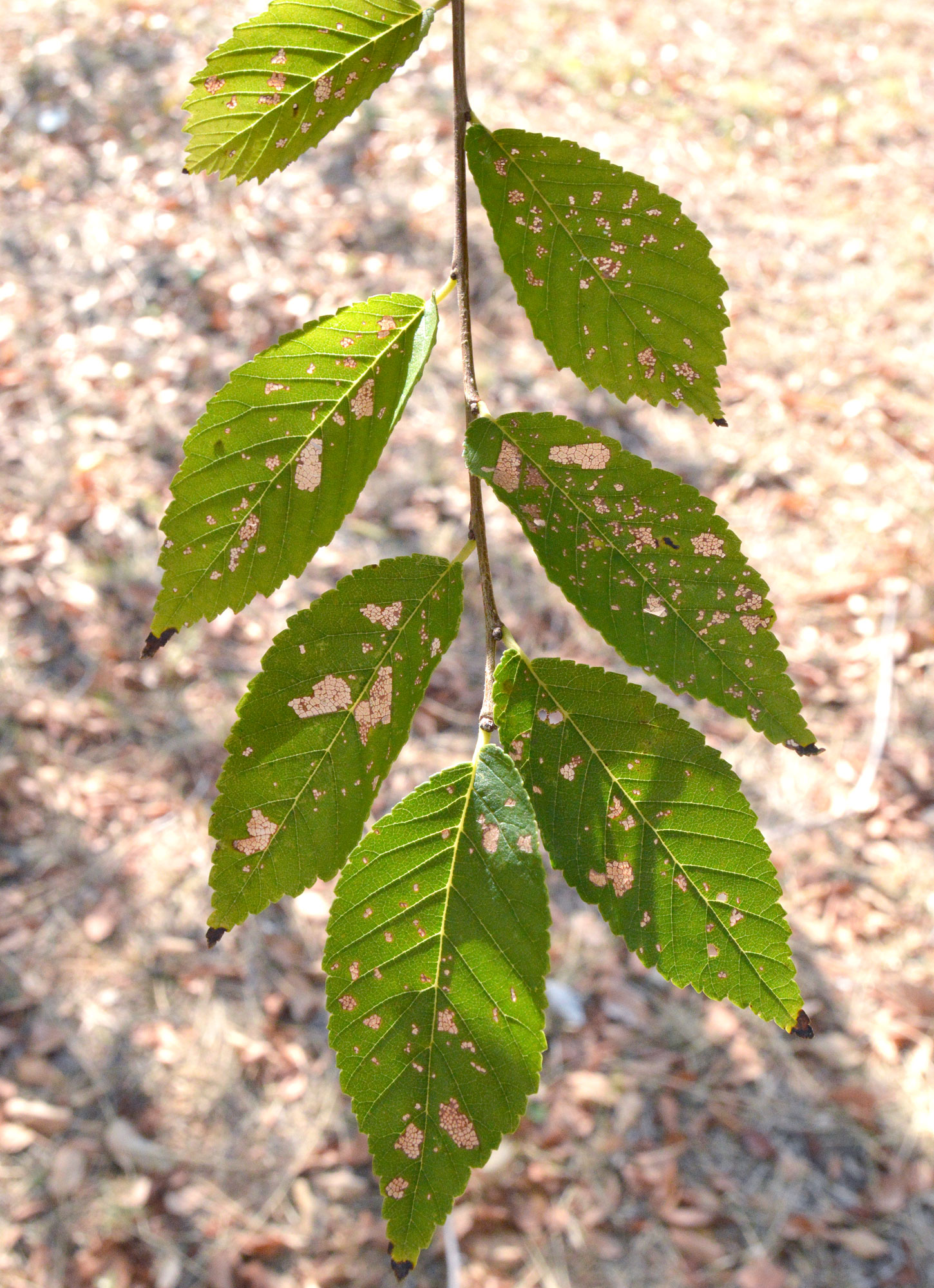 Los olmos que pude observar no estaban muy dañados por la galeruca. Podría decir que se encuentran levemente dañados. Quizás esto se deba al hecho de que en la zona donde vivo el olmo se planta poco. De hecho, yo relaciono los olmos con terrenos incultos donde crecen espontáneamente. Por ejemplo, se pueden encontrar junto a las vías del tren, en un terreno urbano que se encuentra sin edificar o en un parque público ocupando espacios no sujetos a diseño previo. Esto contrasta con otras zonas de la Península Ibérica donde los olmos son plantados en los alcorques de calles y avenidas. En la zona de Barcelona, hasta hace unos años, en los alcorques se plantaban por sistema plátanos de sombra (Platanus x hispanica) [1].