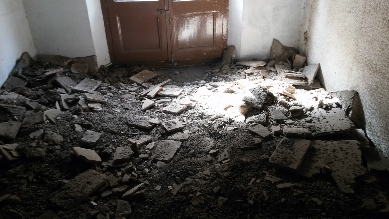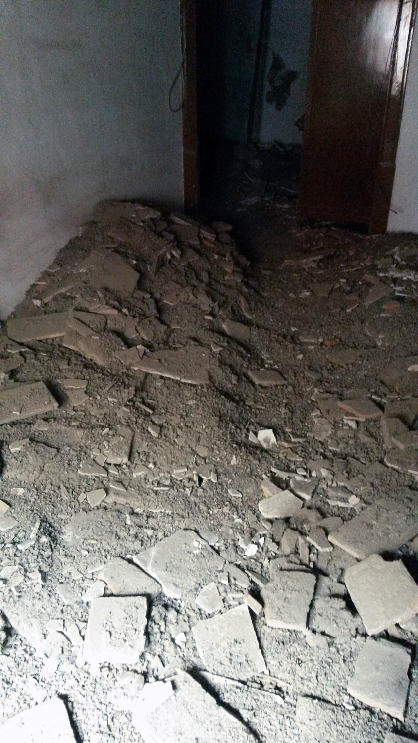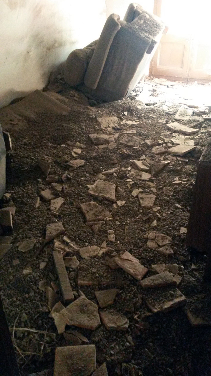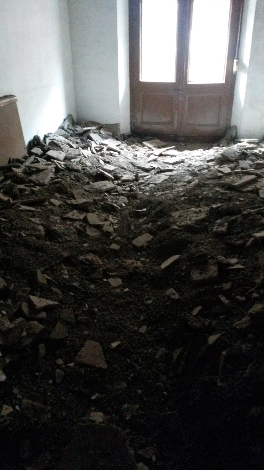 Las palomas se habían instalado entre el forjado del techo de la vivienda y el forjado de la cubierta transitable, es decir, del terrado. Este espacio vacío, típico de los edificios antiguos de Barcelona, recibe el nombre de cámara de aire. Se encuentra ventilado gracias a unas aperturas que dan al exterior y que sirvió para que se instalaran las palomas. En las imágenes 2 y 3, se puede ver la cámara de aire entre los dos forjados. En el resto de imágenes de esta entrada, se puede ver detalle de las principales zonas afectadas de la vivienda que son las habitaciones que dan a la calle. Se pueden ver los escombros de obra y la gran cantidad de excrementos que se acumularon. Había más excrementos que escombros.