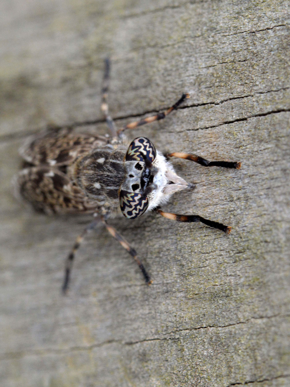 El tábano que capturé mide unos 13 mm. Según el catálogo de Diptera realizado por Miguel Carles-Tolrá, en la Península Ibérica contamos con 12 especies del género Haematopota [1]. Una de las especies comunes es Haematopota pluvialis, que en inglés es conocida como common horse fly. Los tábanos de las imágenes puede que pertenezcan a esta especie. No lo sé con certeza, porque no dispongo de claves. Particularmente, encuentro bonito el tábano gris mate. Tiene un aspecto extraño que podría calificar como de marciano. No tienen desperdicio los dibujos en los ojos y alas.