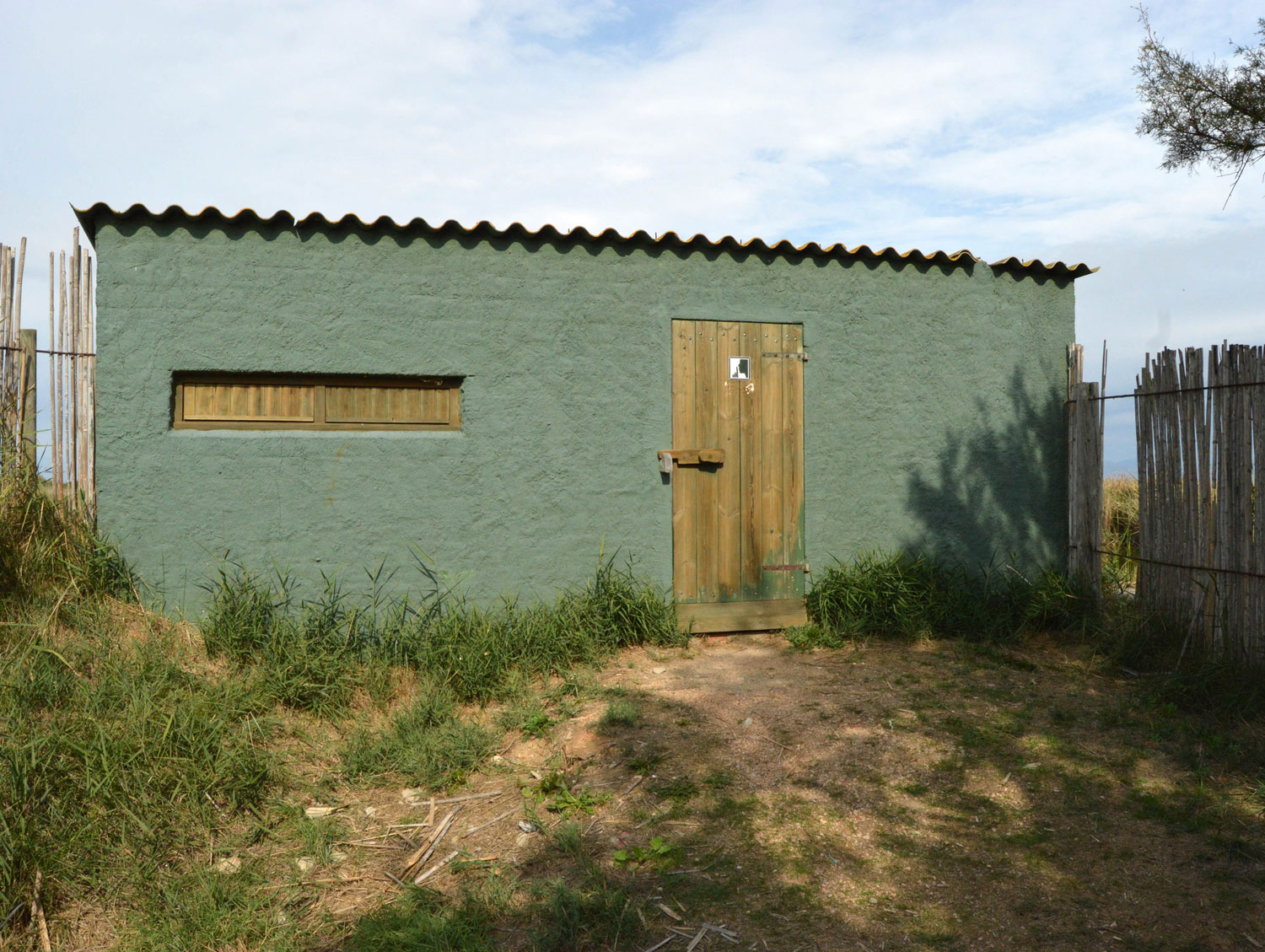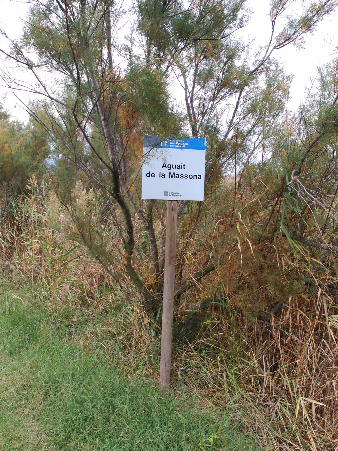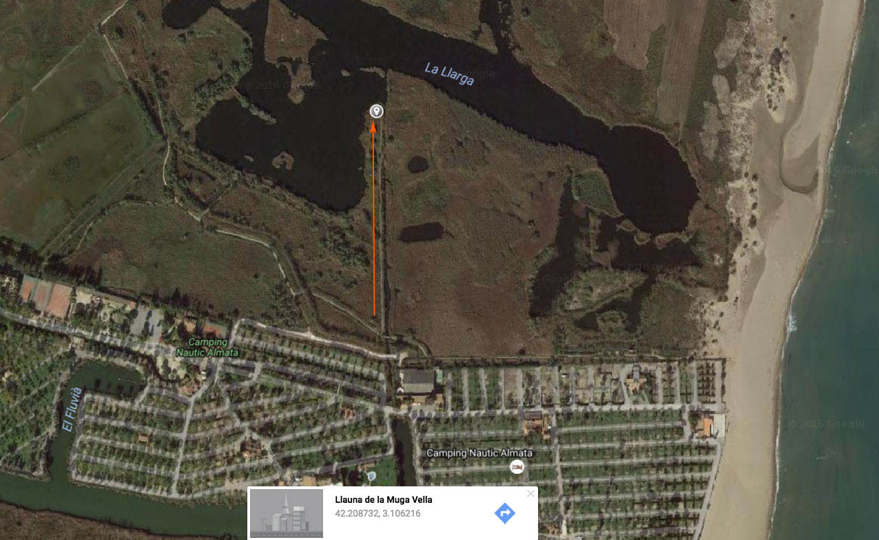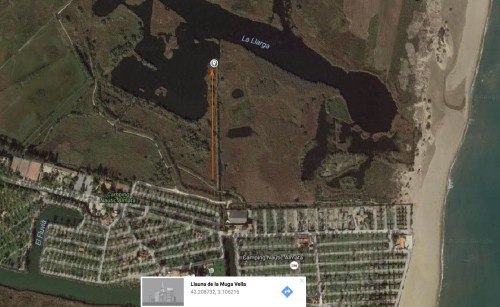 Llegamos a un encrucijada en la que un cartel indicaba la dirección al avistadero de la Massona (figura 2). Decidimos tomar el camino para sentarnos a observar aves. Al llegar, vimos una cabaña de obra con ventanucos pequeños y alargados (figura 1). Una construcción hecha para ver sin ser visto. En la imagen número 3, se puede ver la posición geográfica de este avistadero que se adentra en la laguna de la Llarga.