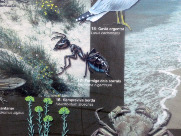 Un aspecto muy interesante de esta invasión de hormiga argentina es que se da en un lugar donde hay una especie muy interesante conocida como hormiga negra de jardín (Tapinoma nigerrimum). Esta especie se describe en los plafones informativos del parque (figuras 11 y 12). He de apuntar que Tapinoma nigerrimum es una de las hormigas problemáticas en entornos urbanos. Sus colonias son muy numerosas, ya que es poligínica (muchas reinas) y polidómica (muchos nidos). Y cuando entra en algún edificio, lo hace en legión. Pero a diferencia de la Linepithema humile, soporta mucho mejor la falta de agua. Es una especie mediterránea. Es por ello que si dispusiera de todo el tiempo del mundo, haría un estudio entre la interacción de ambas especies, ya que creo que Tapinoma nigerrimum es la única capaz de frenar el avance de la invasora Linepithema humile. Pero solo frenar. No, reconquistar. Hay que tener en cuenta que Linepithema humile es una especie que no descansa ni en invierno.