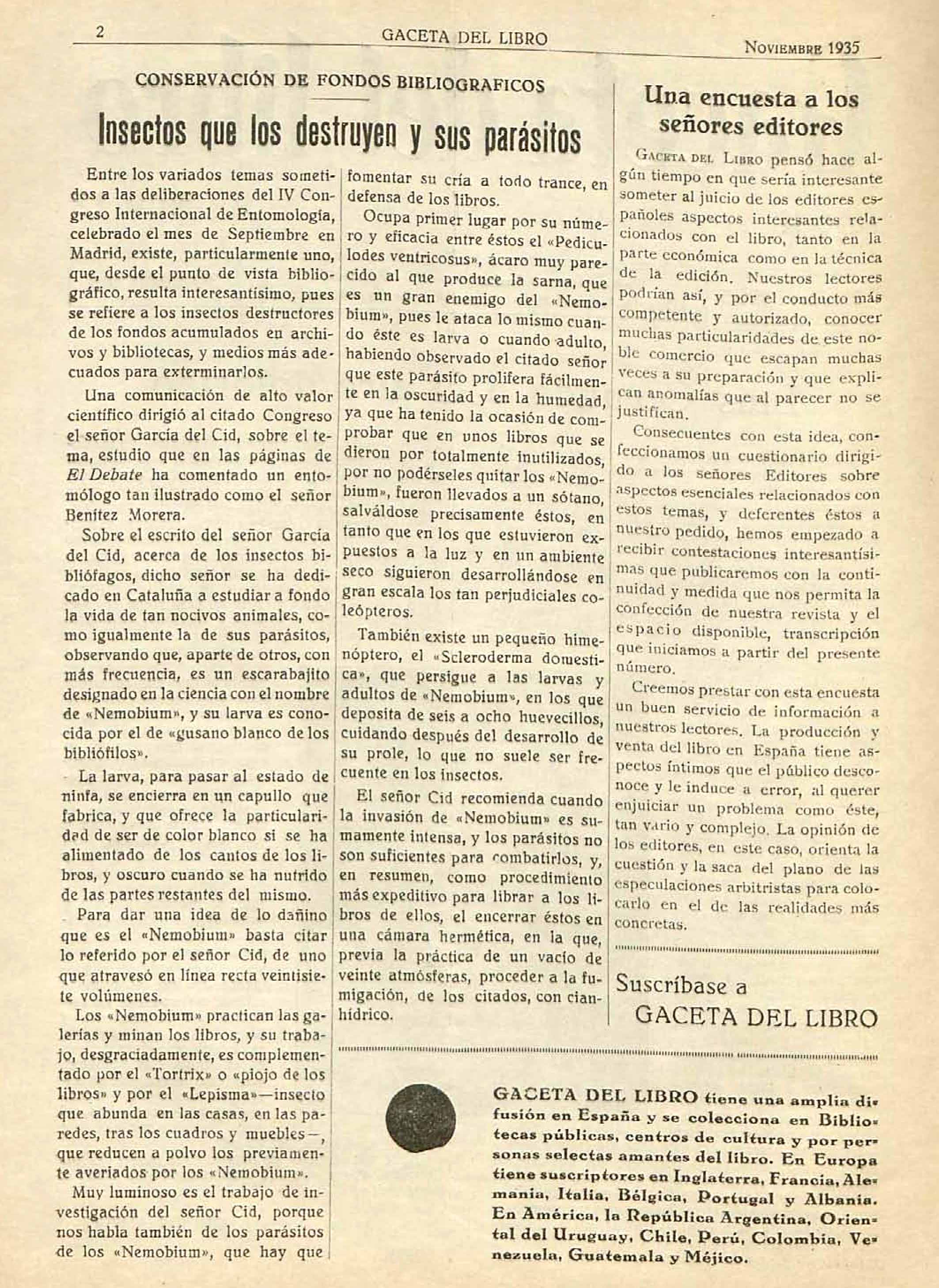 [2] Anónimo. 1935. Conservación de fondos bibliográficos. Insectos que los destruyen y sus parásitos. Gaceta del Libro, noviembre de 1935, Año II, No. 13, edita Librería Miguel Juan, c/ Pascual y Genís, 14, Valencia.