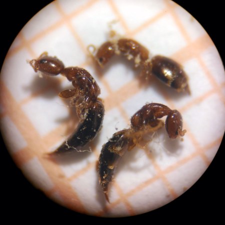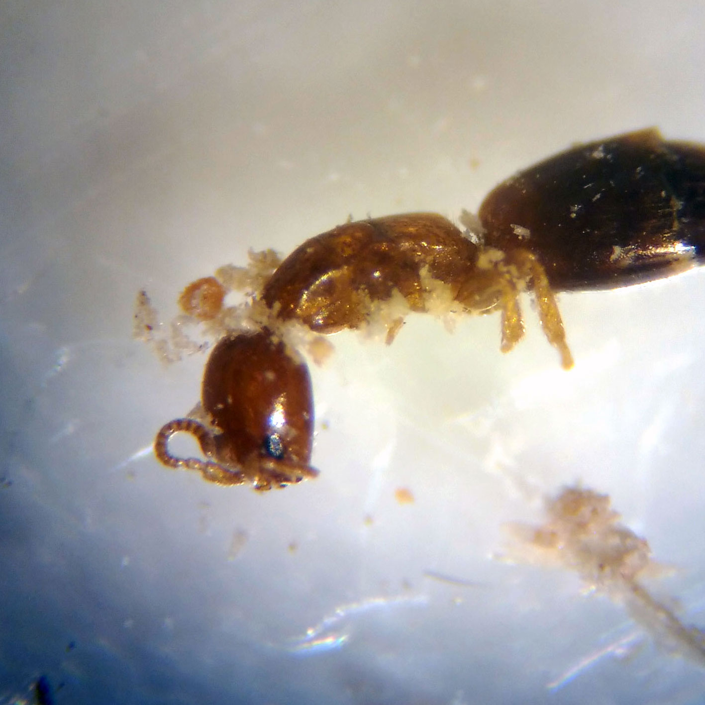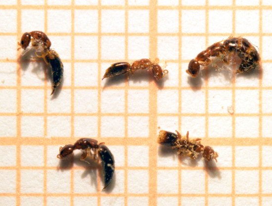 En la imagen número 1, se pueden ver ejemplares de carcomas y de sus parasitoides. Las carcomas pertenecen al género Oligomerus (Anobiidae). Y los parasitoides pertenecen al género Sclerodermus (Bethylidae). Estaban en el fondo de una caja donde guardo los restos de una silla carcomida. Hace cosa de tres años, me deshice de la silla, no sin antes quedarme con algunos trozos que aserré en pequeñas partes y metí en una caja de plástico cerrada herméticamente. Muy de vez en cuando la abro y, si veo ejemplares de carcomas y parasitoides, los recojo y los guardo en un pote de muestras. Hasta el momento han ido apareciendo muertos algunos ejemplares, no muchos. Los que se pueden ver en las imágenes son los que están en mejor estado de conservación. Es interesante hacer constar que no he encontrado ningún ejemplar alado, es decir, ningún macho. Lástima. Parece ser que algunas especies de Sclerodermus se reproducen por partenogénesis, siendo los machos escasos de ver.