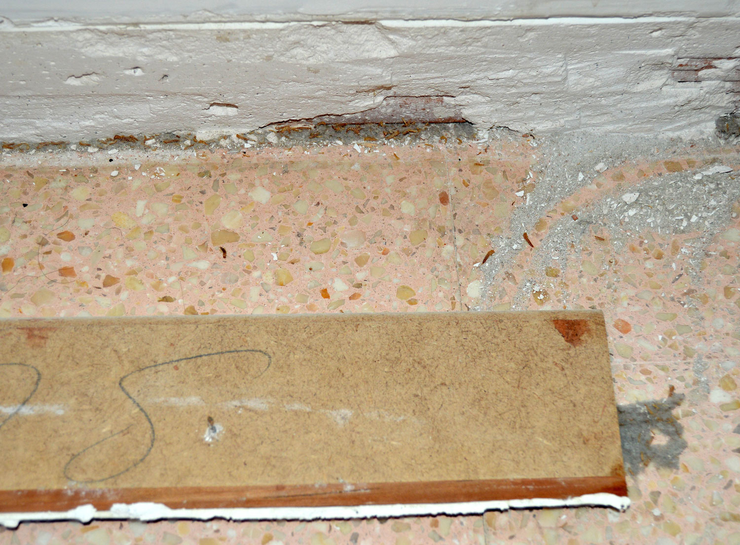 Fig 1. Zócalo retirado con mudas y larvas de escarabajo de la alfombra (Attagenus)./ C. Pradera 10-2016