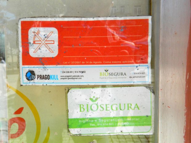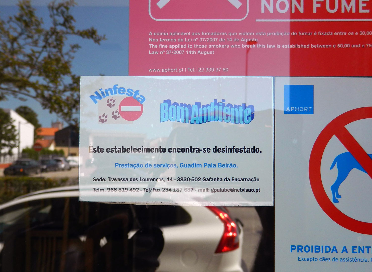 El pasado mes de agosto tuve la oportunidad de viajar a Portugal y pasar unos días en Oporto y alrededores. No conocía este cercano país. Quedé impresionado por su gente y sus paisajes. Y por su buena comida y buen vino. Me quedé con ganas de ver más. Espero en un futuro regresar. Como cualquier turista, eché mano de la cámara fotográfica para fijar los recuerdos. Y entre las fotografías que tomé se colaron algunas que tienen que ver con el sector en el que trabajo, con el control de plagas que traducido al portugués se dice controlo de pragas. De la misma manera que en España, en los bares y restaurantes de Portugal se pueden ver los certificados de garantía que extienden las empresas de control de plagas. Aunque existen algunas diferencias entre los certificados de ambos países.